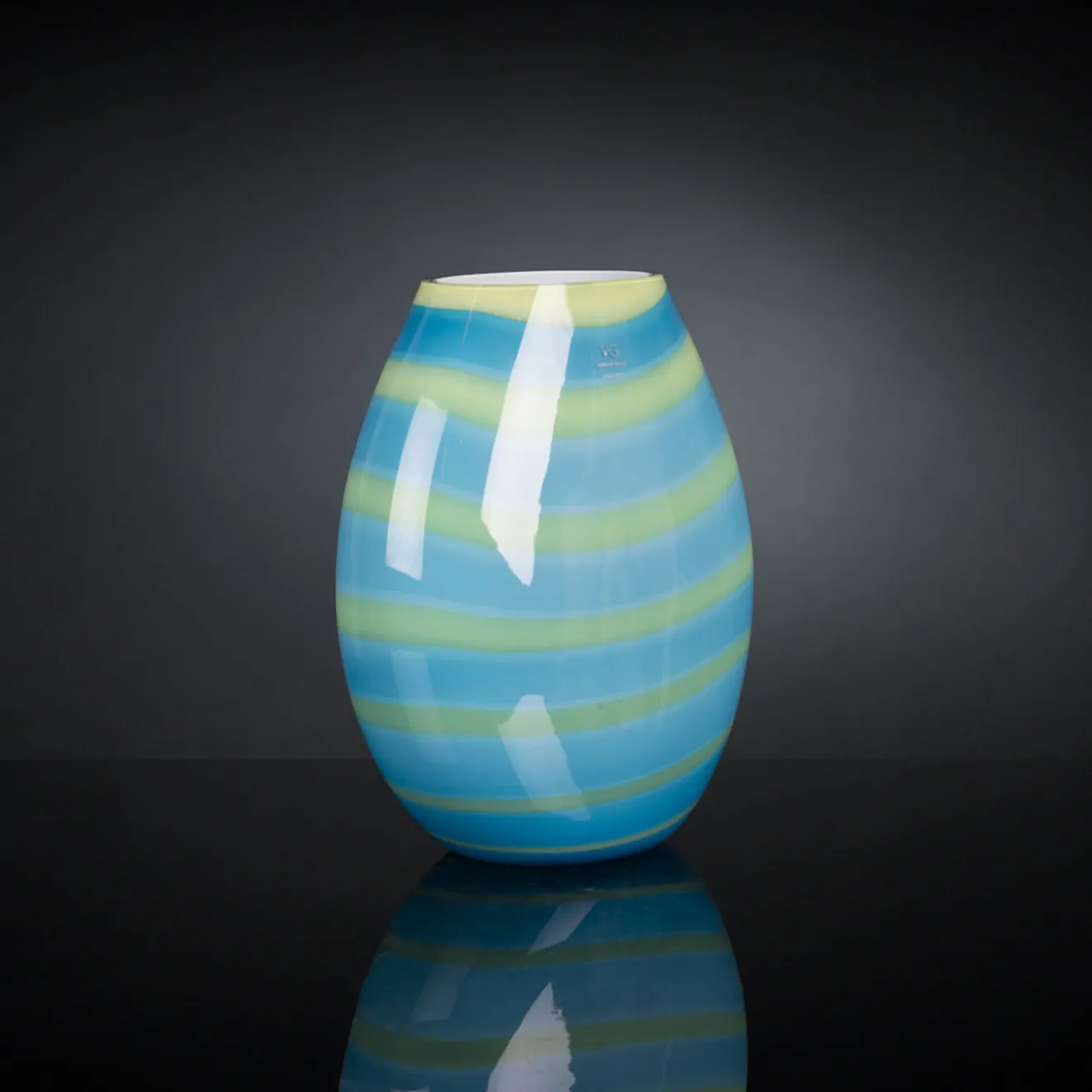 Parte di una serie che ricrea i colori e i delicati movimenti di un calmo fondale marino, questo splendido vaso vanta una suggestiva tonalità turchese arricchita da strisce verde-giallo, che ricordano i toni delle alghe. Un pezzo unico di arredamento contemporaneo, interamente realizzato a mano in vetro.