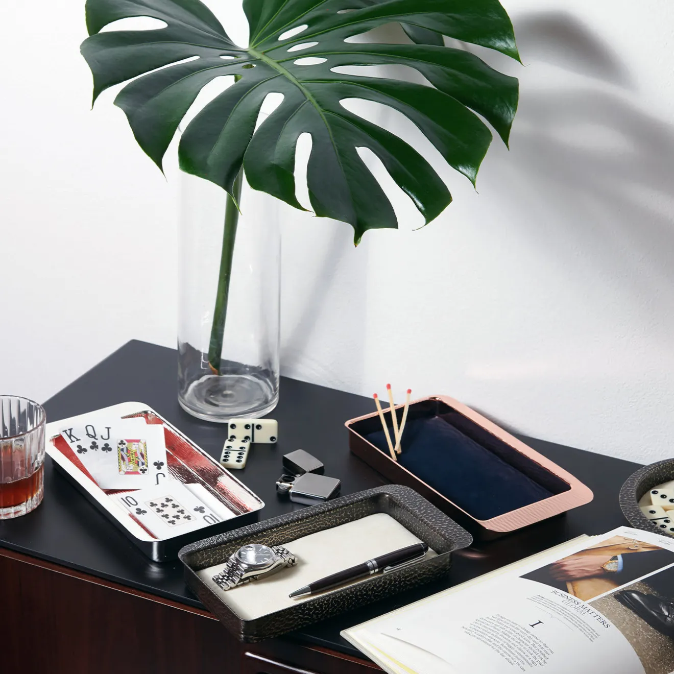 Un design audace, questo vassoio per tasche vuote è interamente realizzato a mano in rame, con una naturale luminosità e un motivo testuale martellato a mano ispirato alla sinuosità dell’acqua. Rettangolare ma dolcemente arrotondato, è in grado di decorare splendidamente un interno contemporaneo. Disponibile anche con un cuscinetto interno rimovibile nei colori bianco panna, rosa, blu o azzurro, o nelle varianti in ottone dorato, bronzo brunito o lega d’argento su richiesta al Concierge.