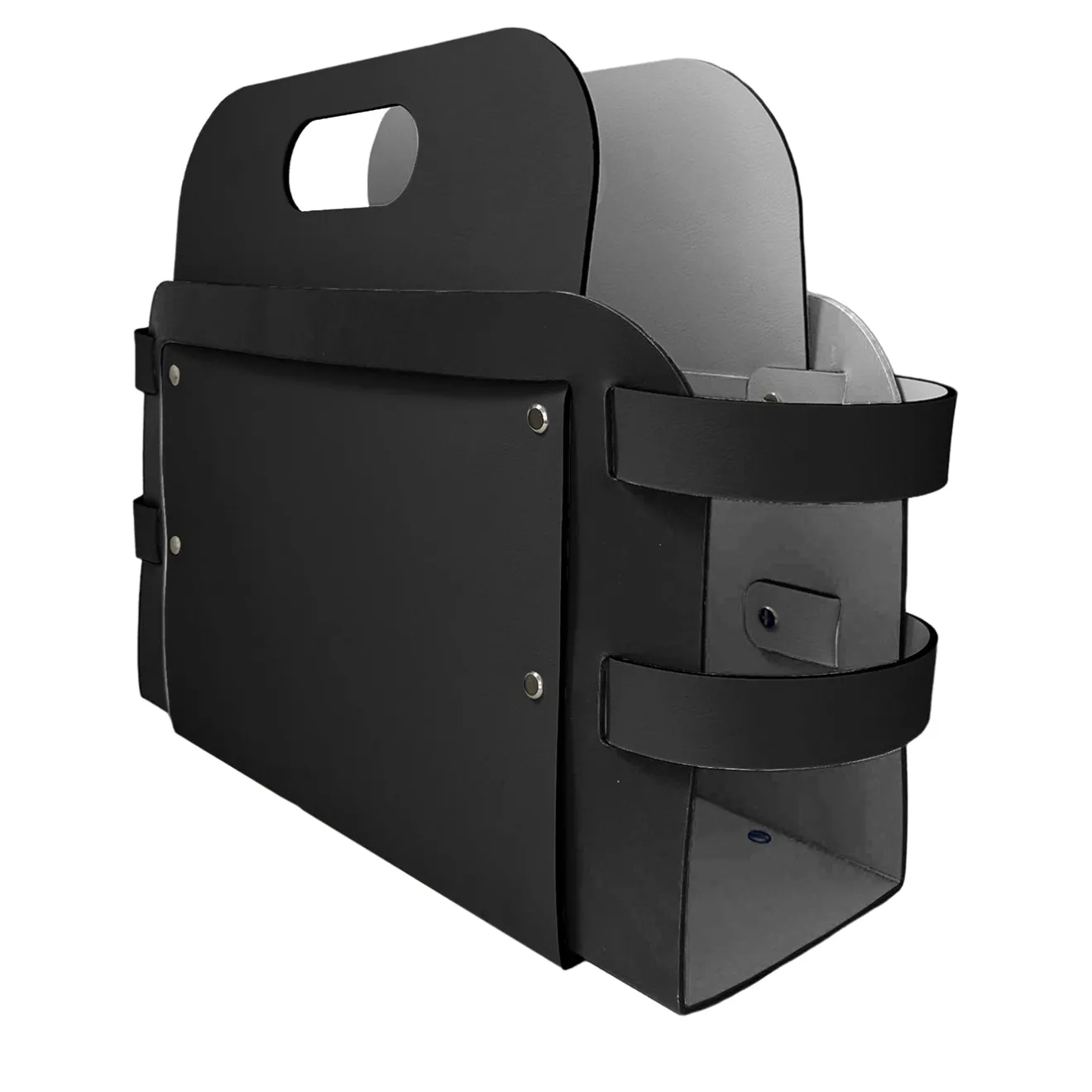 Compatto e strutturato, questo portariviste in pelle nera presenta la forma distintiva di una borsa da lavoro, unendo praticità ed estetica raffinata. Progettato da Ekaterina Borovkova, è realizzato con due strati di pelle per garantire maggiore stabilità, mantenendo al contempo un aspetto elegante e funzionale. L’intaglio per la maniglia e i lati rinforzati assicurano facilità di trasporto e resistenza, rendendolo una soluzione di archiviazione elegante e di stile per riviste.