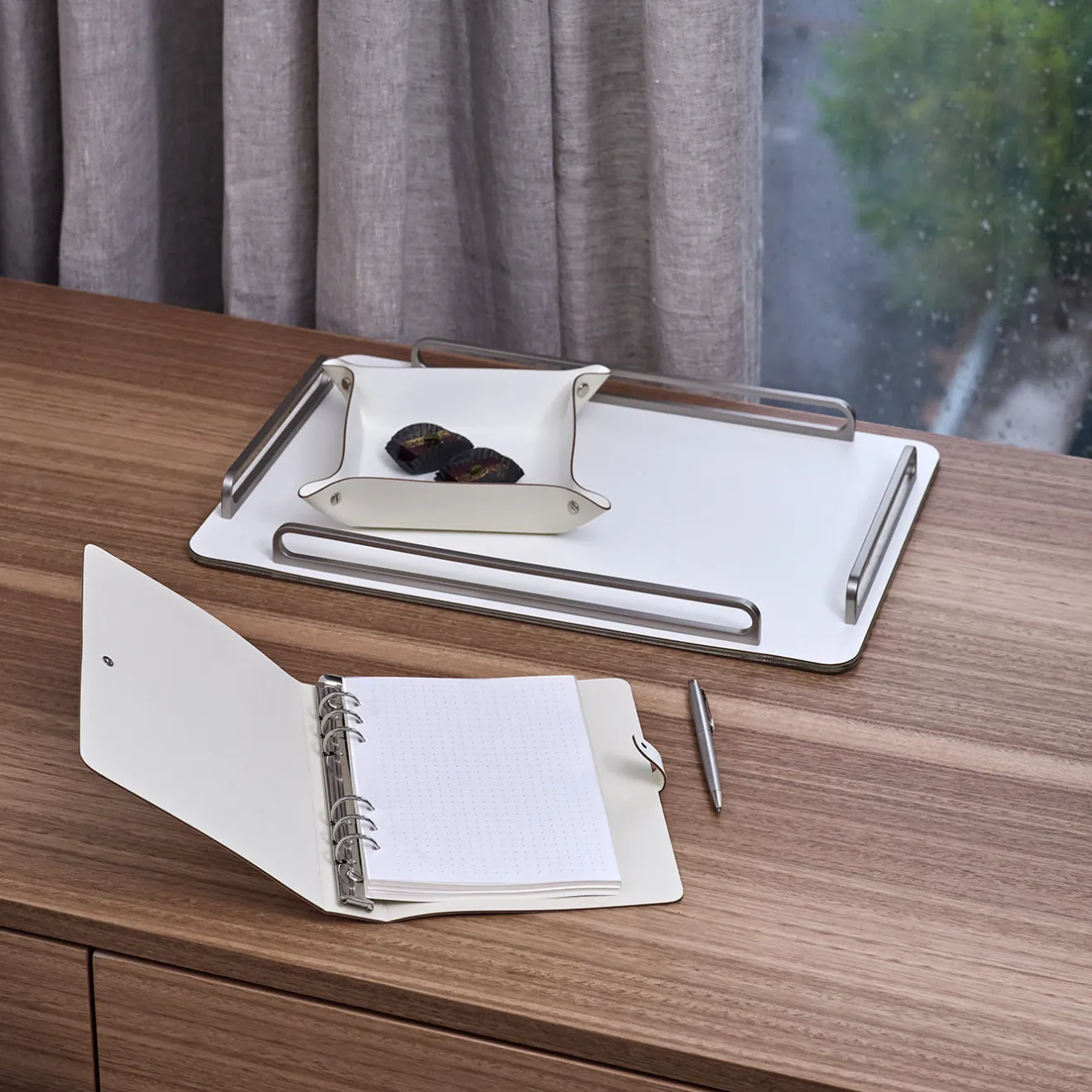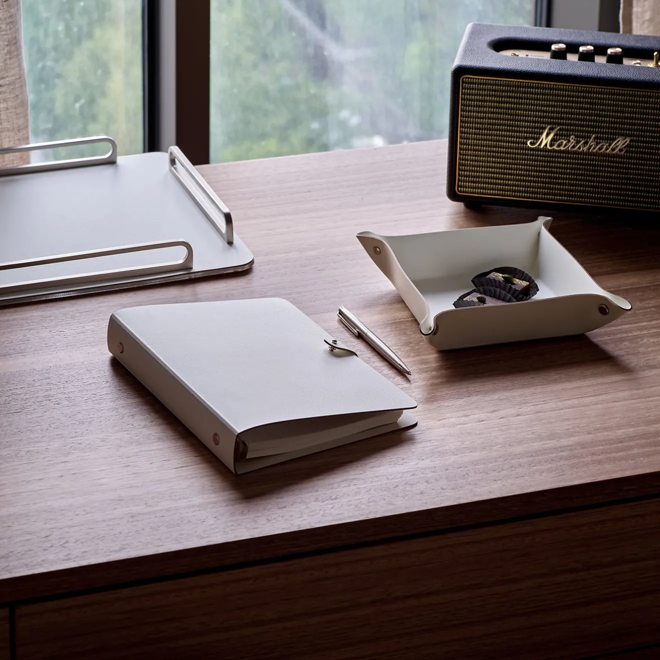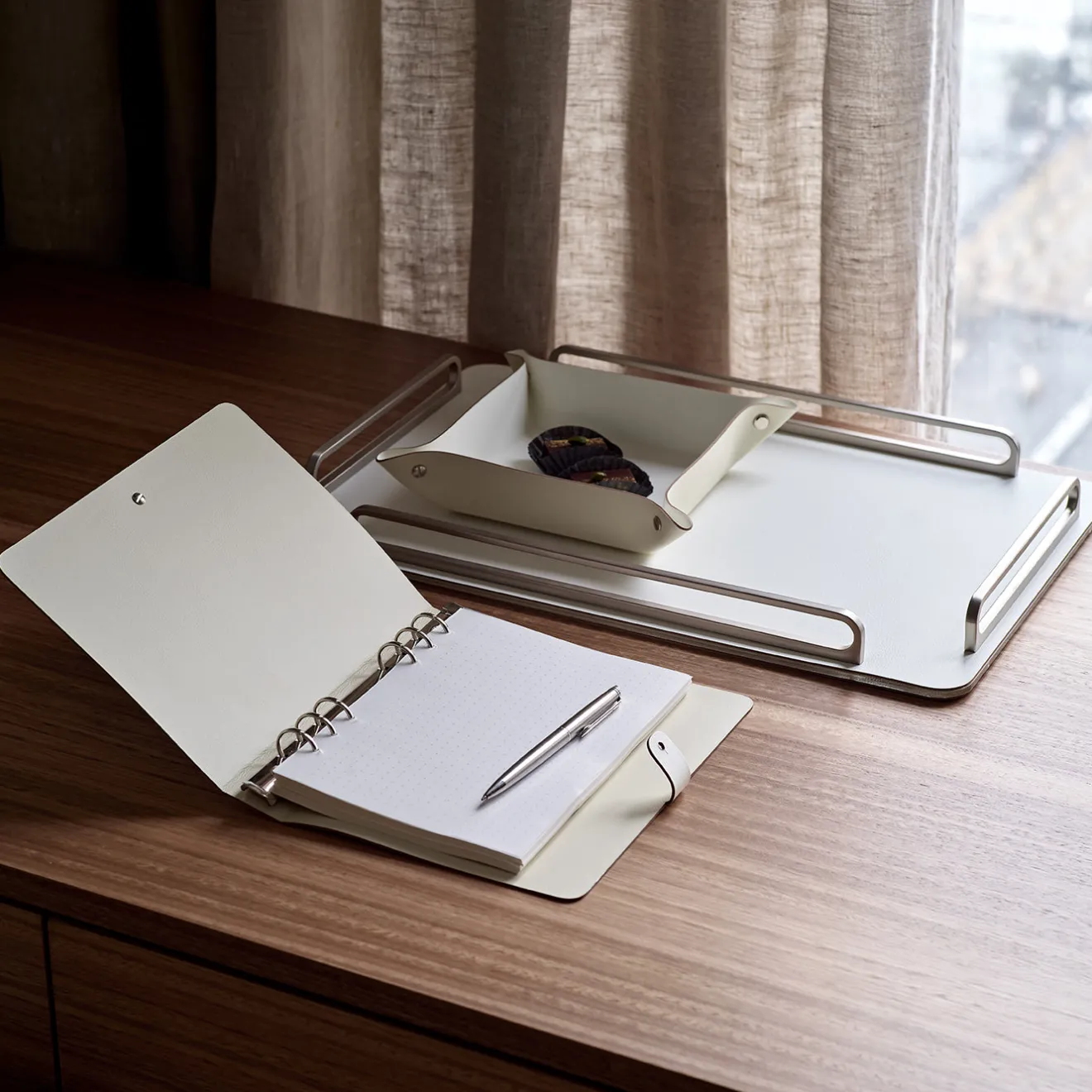 Un vide poche pratico, pensato per organizzare piccoli oggetti da scrivania come graffette, monete e chiavi, mantenendoli sempre in ordine e facilmente accessibili. Caratterizzato da una palette nei toni panna cotta e bianco, offre uno stile minimalista e raffinato. Gli angoli ripiegati e fissati con borchie aggiungono un dettaglio discreto, mantenendo una silhouette pulita ed essenziale. Disegnato da Ekaterina Borovkova, questo accessorio unisce funzionalità ed eleganza sobria, perfetto per qualsiasi ambiente di lavoro.