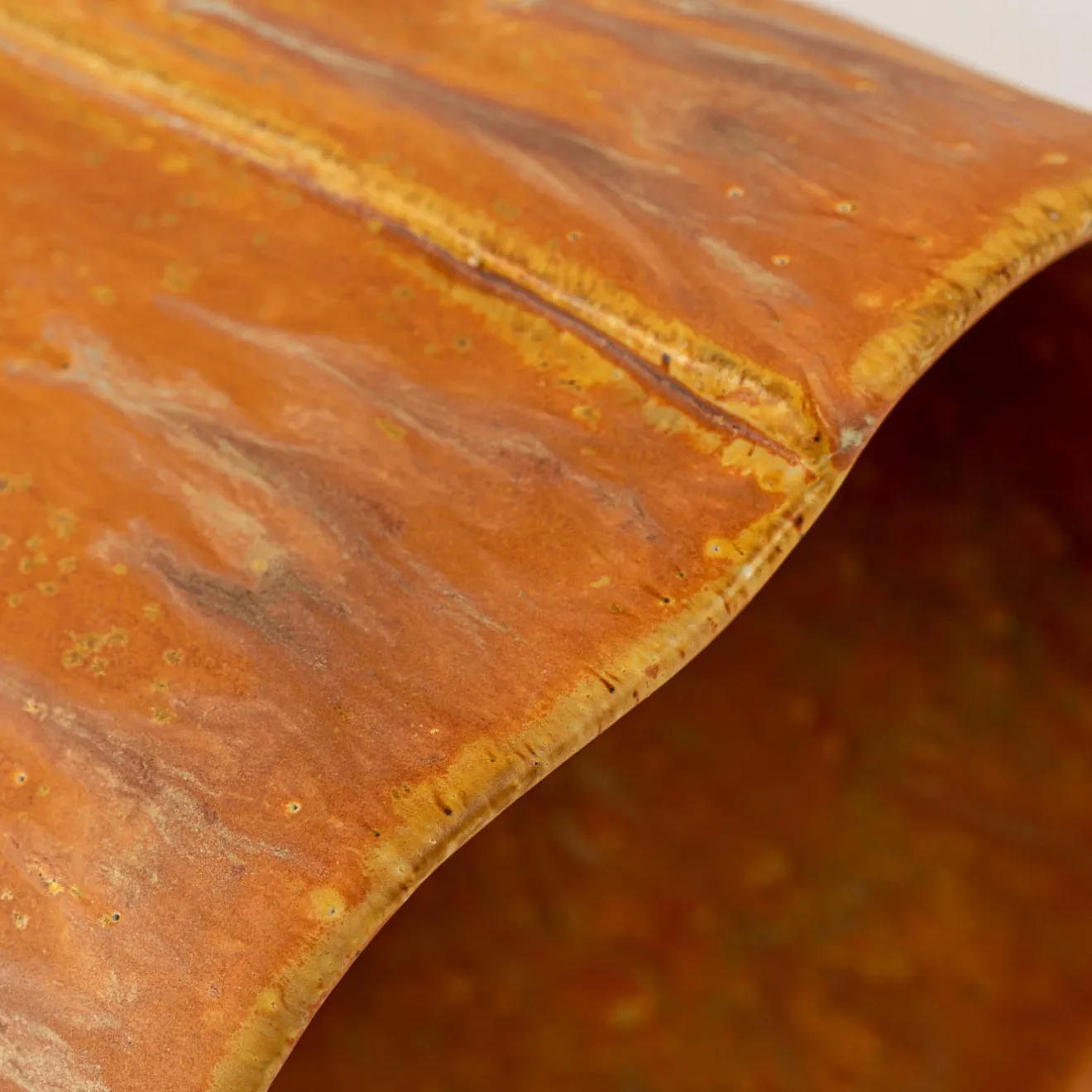 Questo vaso da fiori in porcellana è caratterizzato da una forma leggermente ovale. La smaltatura è satinata di colore arancione scuro, screziata da macchie verdastre e grigie. La tecnica utilizzata è quella della colata in cartone. Si tratta di un pezzo unico.