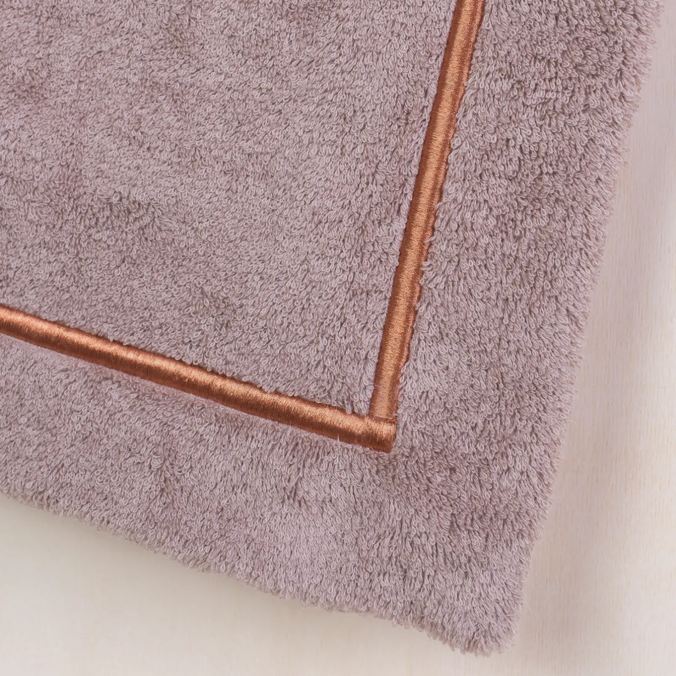 Questo elegante telo mare color tortora è realizzato in cotone egiziano della migliore qualità, impreziosito da un nastro color bronzo ricamato in filo di Lurex che corre lungo il suo perimetro. La targhetta metallica con il logo è stata impressa e presenta una finitura in oro 18 carati.