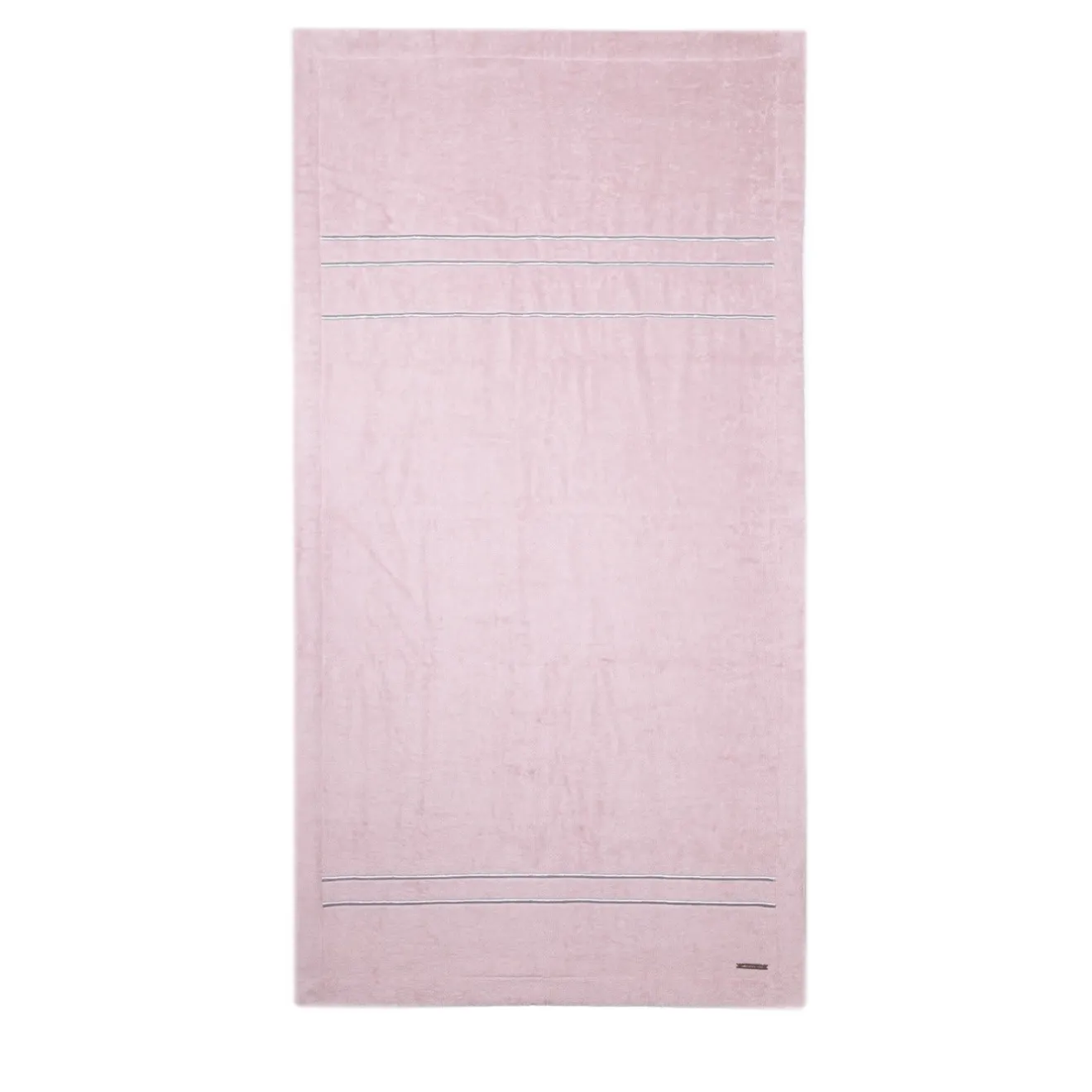 Questo elegante telo mare rosa cipria è realizzato in cotone egiziano della migliore qualità, impreziosito da cinque ricami argentati in filo di Lurex che ne attraversano la superficie. La targhetta metallica con il logo è stata impressa e presenta una finitura in palladio.