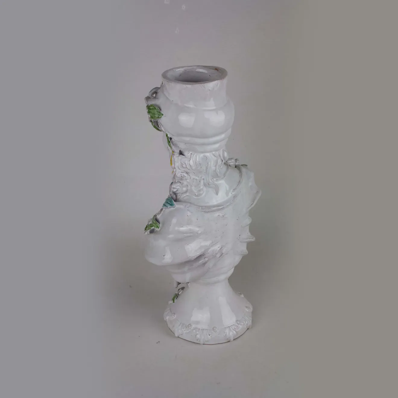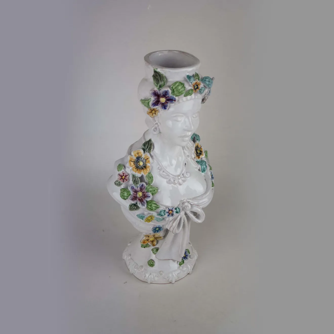 Aggiungete un tocco di primavera e di colore a qualsiasi spazio con questa bellissima scultura a busto in ceramica smaltata. Questo pezzo in ceramica bianca raffigura il busto di una donna con le fattezze dei Mori, che abitavano la Sicilia in epoche passate. La donna indossa i colori della primavera: la testa e le spalle sono drappeggiate con fiori multicolori, i cui dettagli sono rifiniti a mano.