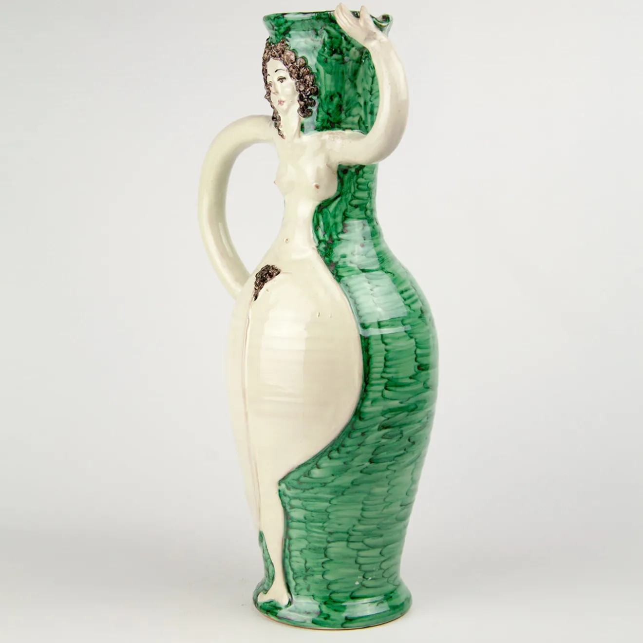 Questo bellissimo vaso con beccuccio è stato realizzato con una combinazione di tornio e modellazione a mano dei dettagli. La forma del vaso imita le curve di una donna nuda e sensuale. Un braccio si allunga verso l’alto in direzione della testa della figura, mentre l’altro braccio si incurva verso la vita creando due manici che completano la figura.