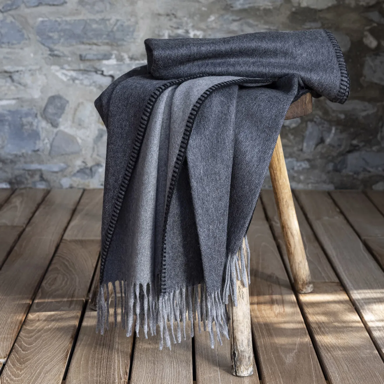Dettagli a frange e cuciture in contrasto di colore lungo i bordi ravvivano l’estetica tranquilla di questa piccola coperta. Realizzata in pregiato cashmere, abbina due tonalità di colore per un doppio uso intelligente che ne sottolinea la versatilità. L’uso di un filato pregiato, morbido e leggero assicura un effetto di vera e propria coccola quando ci si avvolge, sia per un’accogliente pausa tè che per una sessione di lettura.