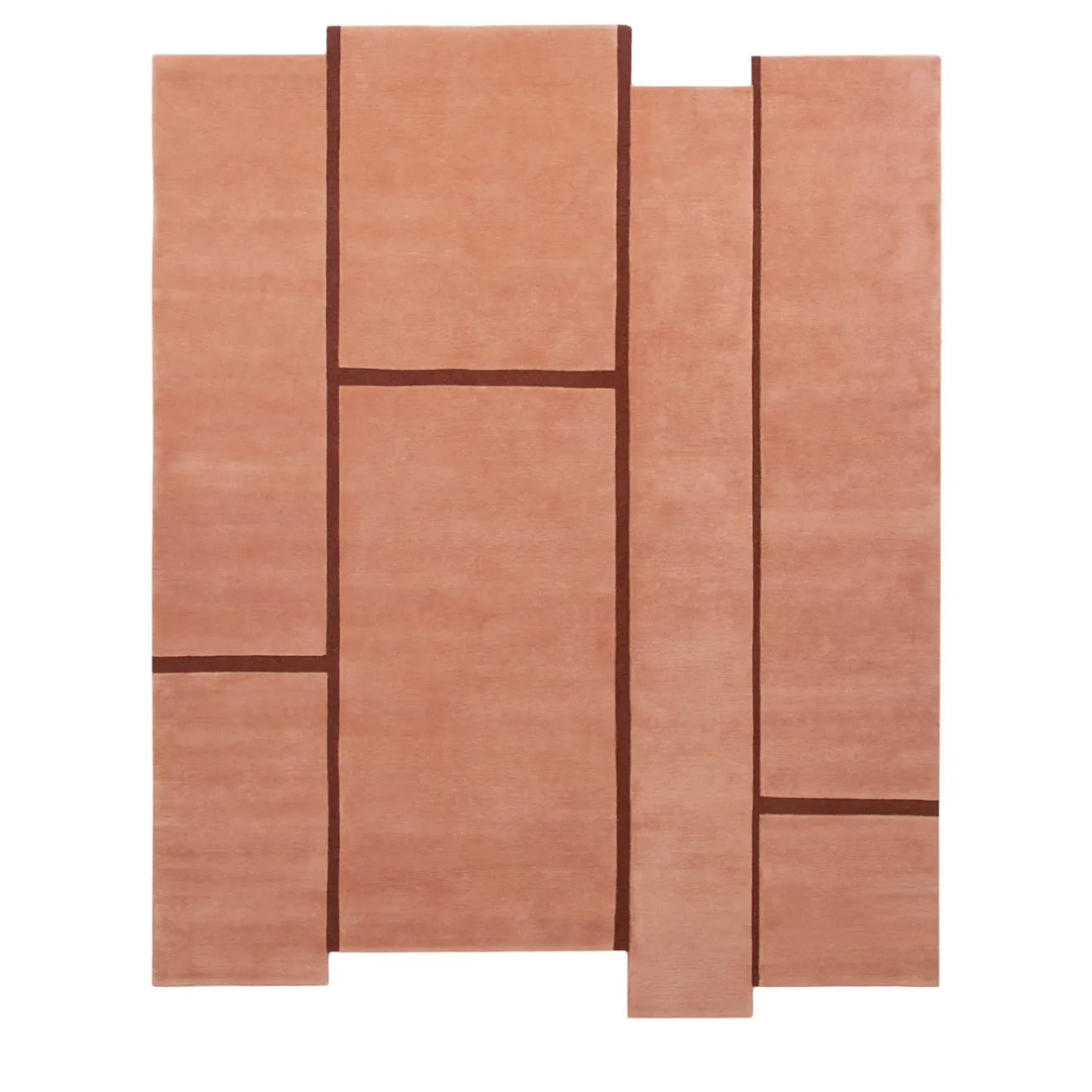 Splendido disegno della serie di tappeti Campiture disegnati da Elisa Ossino, questo pezzo pregiato simboleggia il rapporto contrastante ma armonioso tra linea e colore. Realizzato nei toni del rosa e del marrone e proveniente dall’India, è annodato a mano con lana 100% neozelandese.