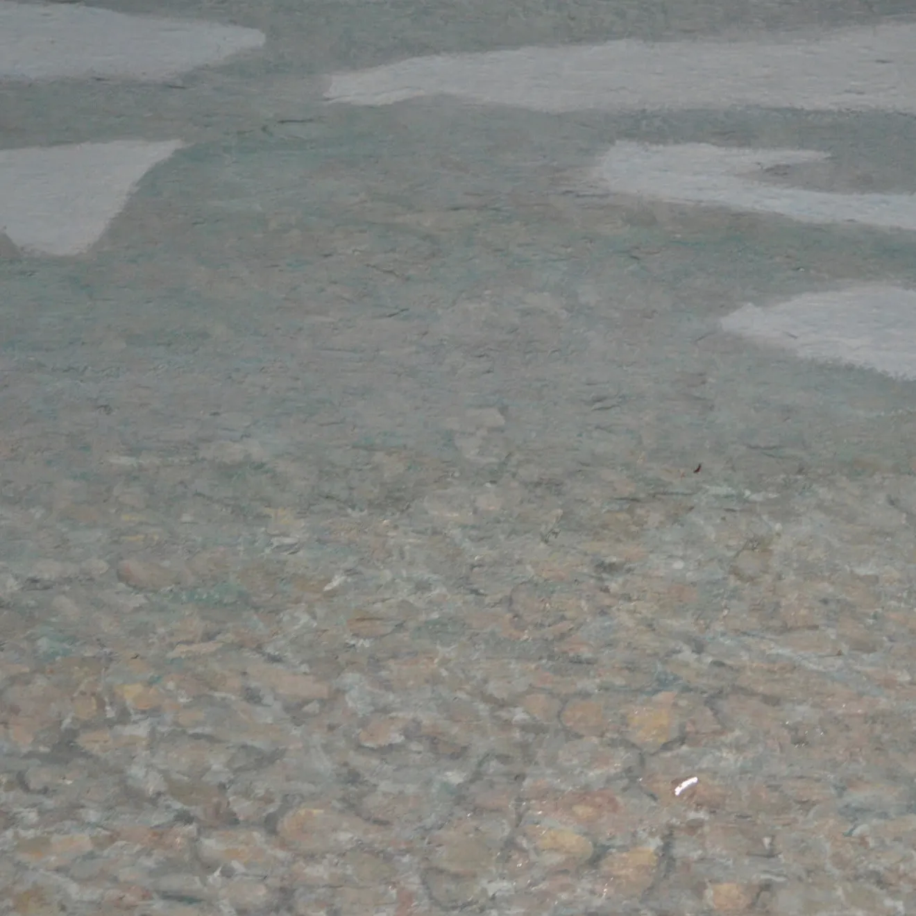 Un invito a esplorare non solo il mondo naturale, ma anche l’incertezza della nostra percezione della vita, questo dipinto a olio su legno presenta un ampio specchio d’acqua che sfuma all’orizzonte. L’acqua limpida e ferma rivela un’infinità di ciottoli in primo piano e piccoli pesci in foglia d’argento che catturano sottilmente la luce. Il cielo appare dipinto in rassicuranti toni pastello, ma il sole è nascosto. I bordi dell’opera sono dorati per formare una cornice naturale.