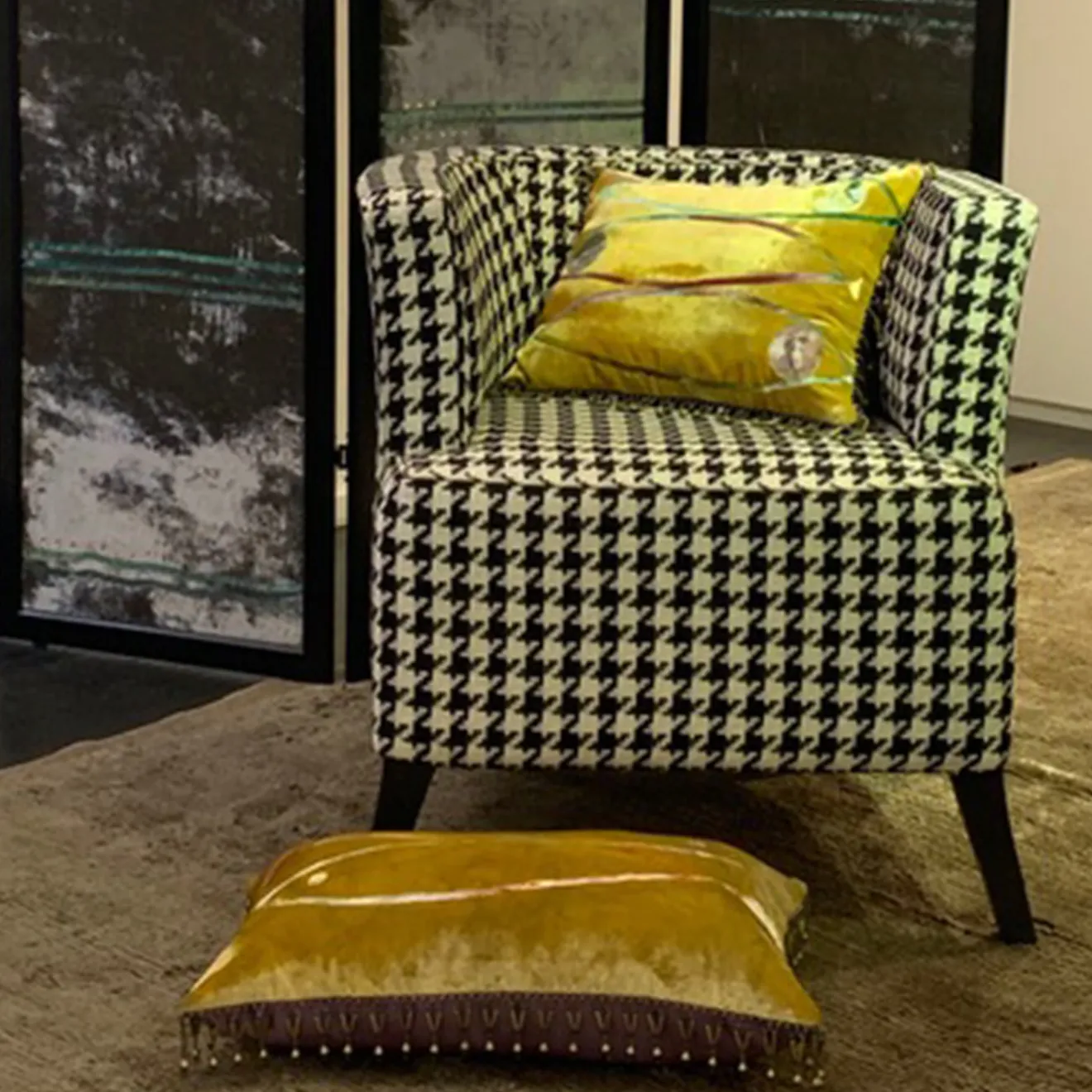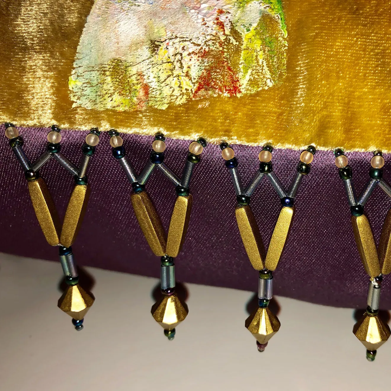 Deliziosamente artistico e lussuoso, il cuscino Two Fishes in velluto di seta è tinto con colori giallo, oro e beige e dipinto a mano con pasta colorata e dettagli in foglia d’oro. Questo cuscino di lusso, con uno splendido disegno di due pesci astratti, presenta una rifinitura in perline di vetro ed è completato da un retro in sontuosa seta viola.
