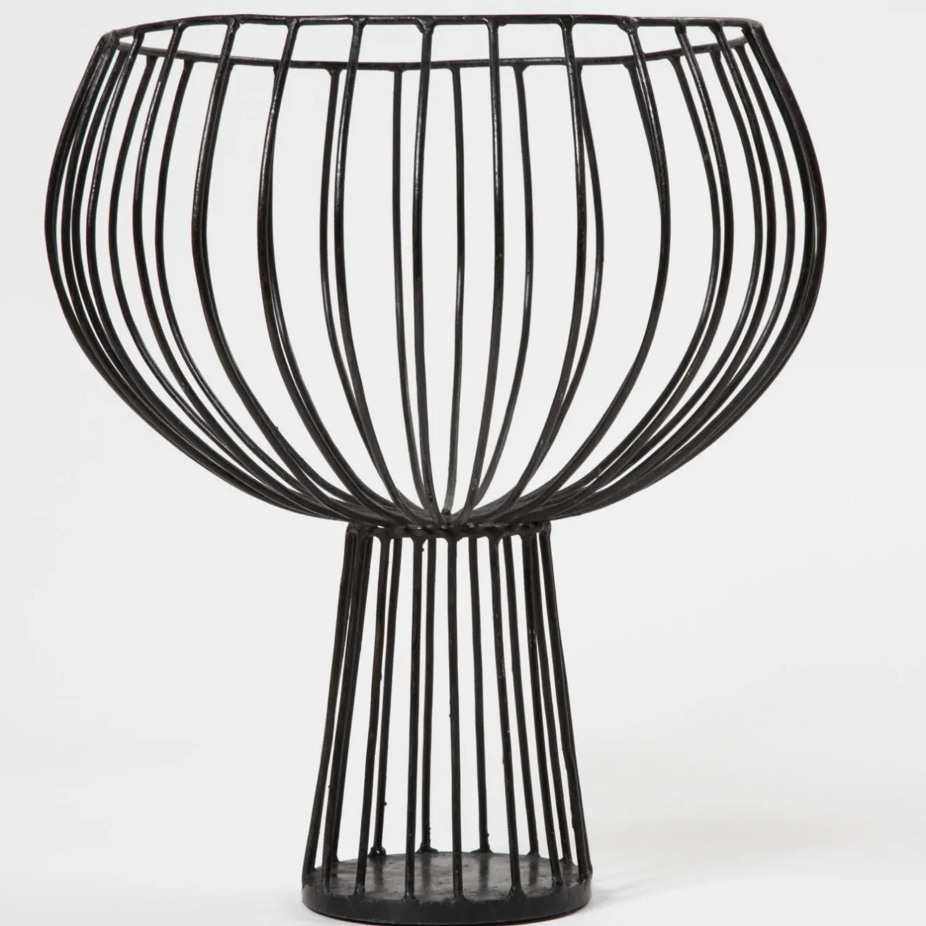 Elegante vaso nero a forma di cupola in filo di ferro zincato, sollevato da un cilindro dello stesso materiale, con linee di ferro a raggiera che sporgono dal bordo e si piegano sui lati. Si consiglia una manutenzione occasionale mediante lucidatura con cera per mobili in legno.