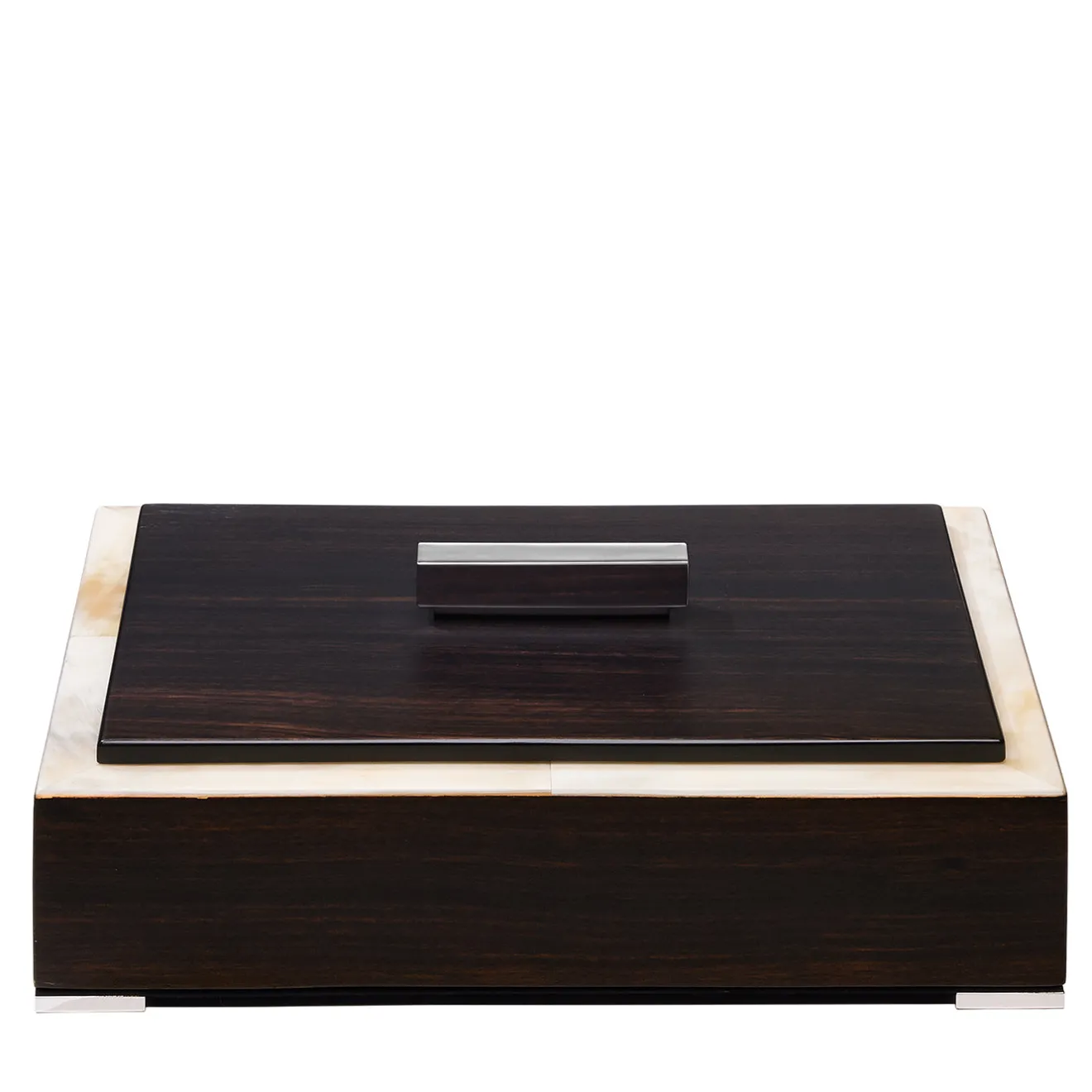 Scatola rettangolare caratterizzata da un telaio in corno opaco, impreziosito da un coperchio in ebano Amara. Il coperchio è completato da una maniglia in ottone cromato, in armonia con i piedini nello stesso materiale. L’interno, foderato in pelle Tosca nera, esprime cura e raffinatezza nei dettagli. Ideale per custodire e organizzare piccoli oggetti con stile ed eleganza.