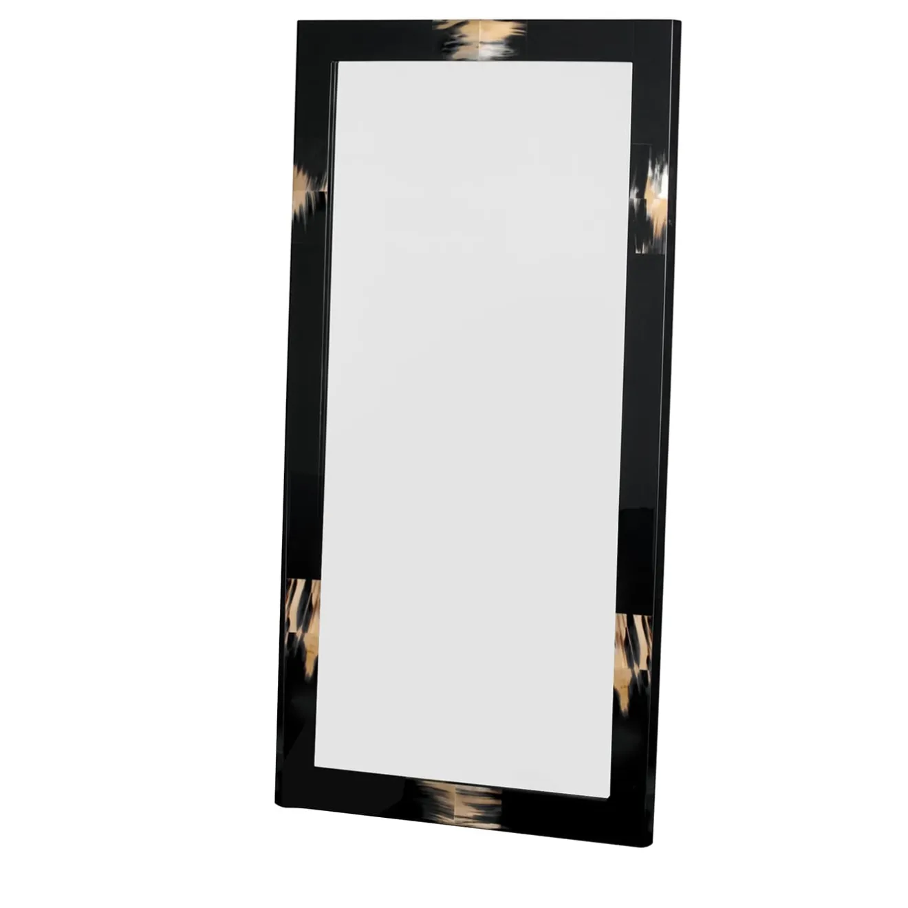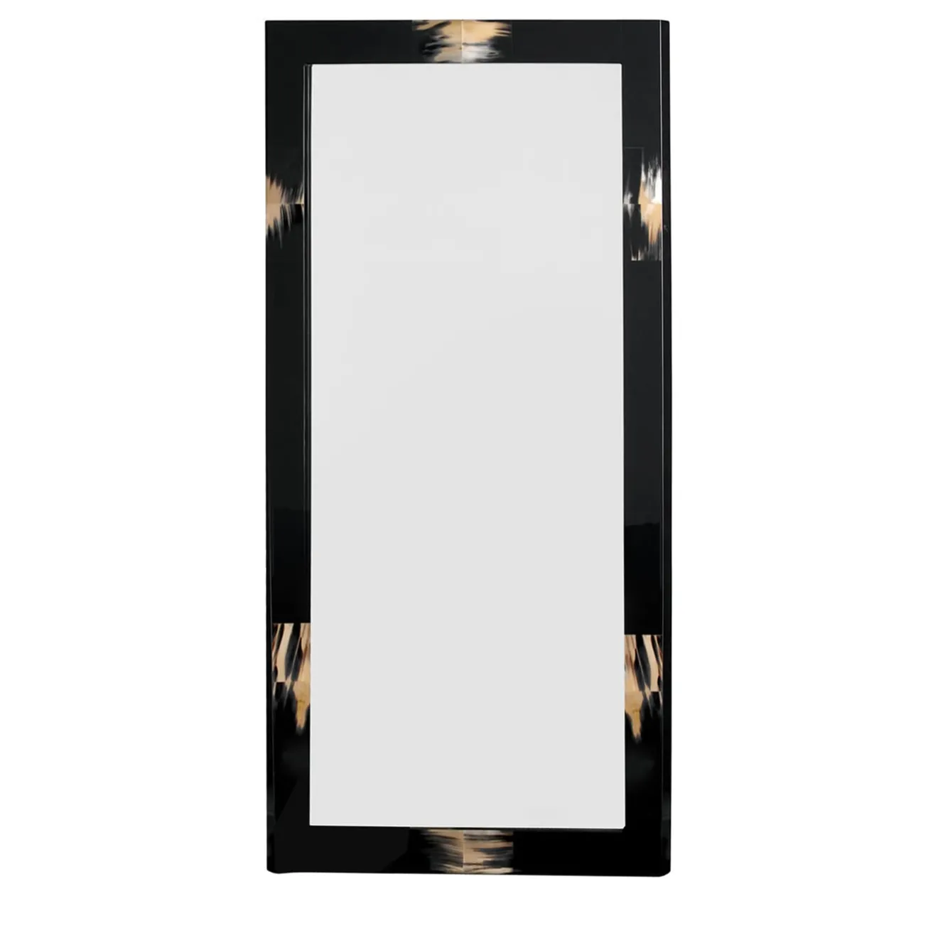 Il minimalismo incontra il lusso in questo esclusivo specchio da parete rettangolare, che deve la sua unicità alla presenza di preziosi intarsi di autentico corno scuro che adornano la sua cornice dalle linee decise e pulite. Realizzata in legno e laccata in nero lucido per una dichiarazione di eleganza senza tempo, la cornice è intarsiata con un corno per un tocco esclusivo.