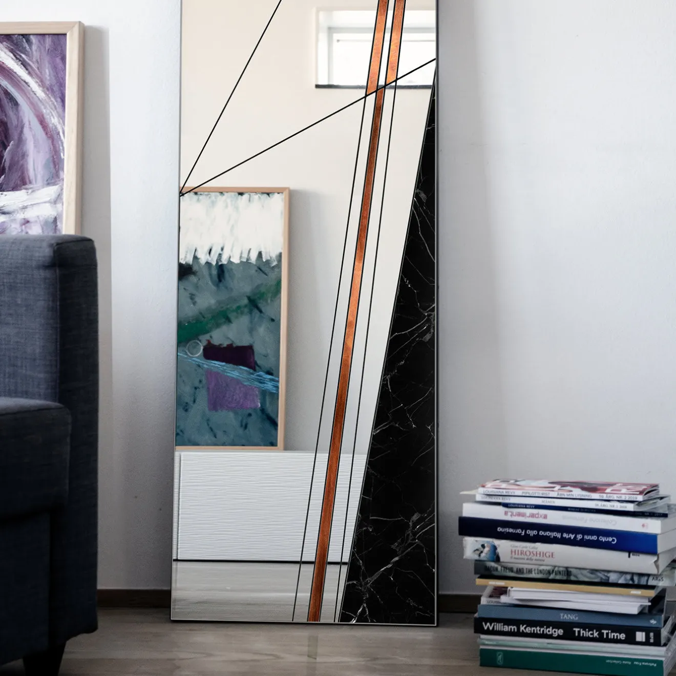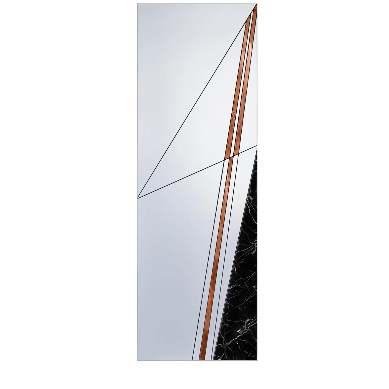 Collocato in un ingresso contemporaneo, in una camera da letto o in un soggiorno, questo squisito specchio da terra si farà notare grazie alla sua sapiente lavorazione artigianale, all’uso di materiali eleganti e al design minimalista che ricrea astrattamente la rete delle antiche strade romane. La struttura rettangolare in legno sostiene una serie di elementi in vetro specchiato uniti da una cornice in alluminio, con l’aggiunta di un inserto in rame spazzolato e di un triangolo in marmo nero Marquina.