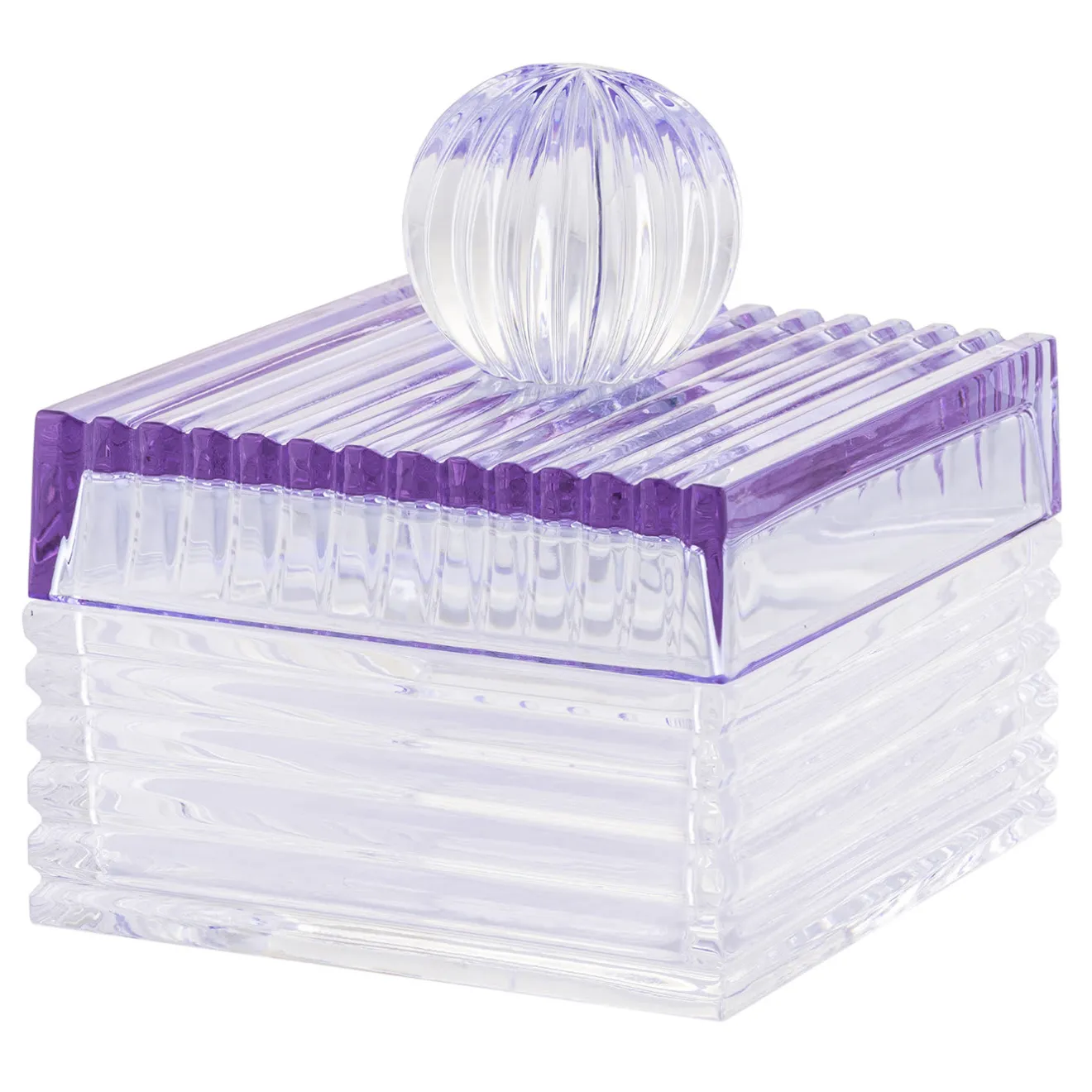Questa preziosa scatola in pregiato cristallo trasparente trasmette un senso di grazia incontaminata, interrotto solo da una magica tonalità di viola che aggiunge profondità alla parte superiore e ai bordi del coperchio. L’affascinante rigore del suo design squadrato è enfatizzato da un’intensa texture scanalata che adorna l’intera silhouette, compreso il terminale sferico che sormonta il coperchio. Il pezzo è un’ottima scatola per i gioielli essenziali.