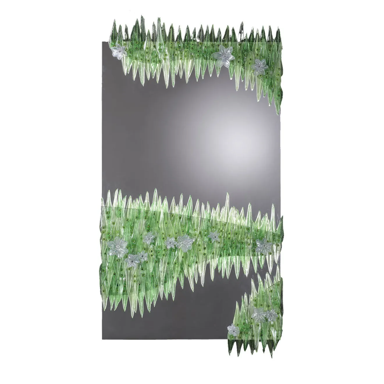 Lo specchio da parete Barena, realizzato in collaborazione con Laura Sattin, presenta un design unico ispirato alla laguna veneziana vista dall’alto, con elementi in vetro verde che somigliano a strisce di terra emergenti dall’acqua. Ogni dettaglio di fiore e foglia è lavorato a mano, componendo un motivo armonioso e organico. Lo specchio è presentato su una base in legno laccato nero elegante, che fonde espressione artistica e decorazione funzionale. È stato esposto nel 2022 come parte di un prestigioso evento di arte del vetro.