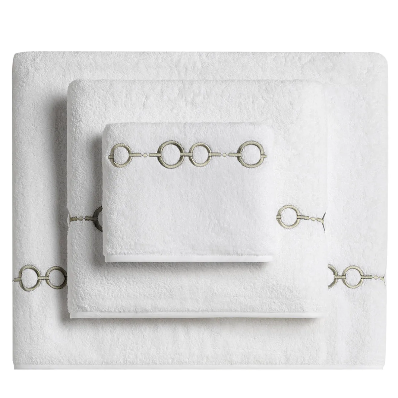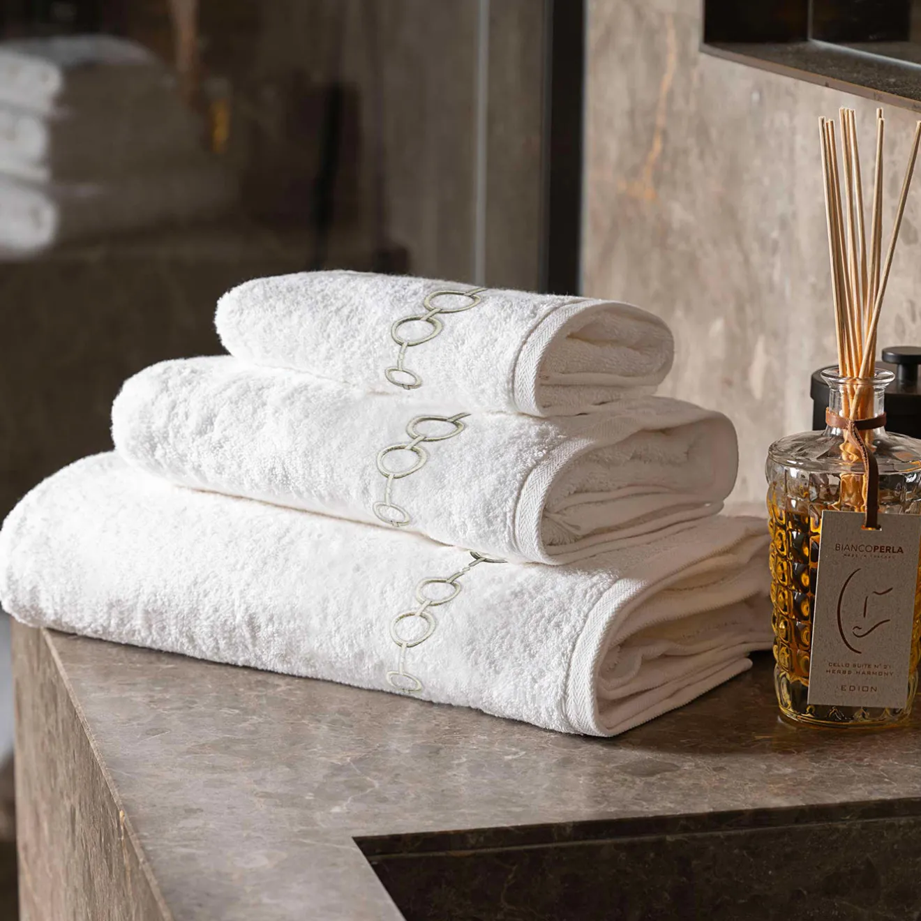 Un set di asciugamani ricamati realizzato in cotone Terry con una densità di 570 gsm. Il set include un asciugamano da ospite (50×80 cm), un asciugamano per le mani (75×150 cm) e un asciugamano da bagno (100×180 cm). Presenta un raffinato motivo di ricamo a catena che esalta il tessuto bianco puro, con ricami personalizzabili in oltre 100 colori. Progettati per combinare eleganza e assorbenza superiore, questi asciugamani possono essere personalizzati in dimensioni su richiesta. Sono disponibili anche pezzi abbinati aggiuntivi. Contattare il Concierge per ulteriori informazioni.