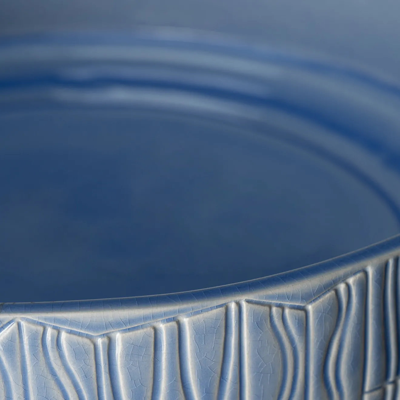 Questo centrotavola di dimensioni medie della collezione Guadalupe presenta una straordinaria smaltatura craquelé blu chiaro con finitura lucida. La forma circolare è arricchita da sottili e astratti motivi lineari lungo l’esterno, che aggiungono texture e interesse visivo. La sua profondità ridotta lo rende adatto a esporre oggetti decorativi o a fungere da pezzo di design su qualsiasi superficie. Progettato da Bethan Laura Wood, questo pezzo combina espressione artistica e funzionalità.