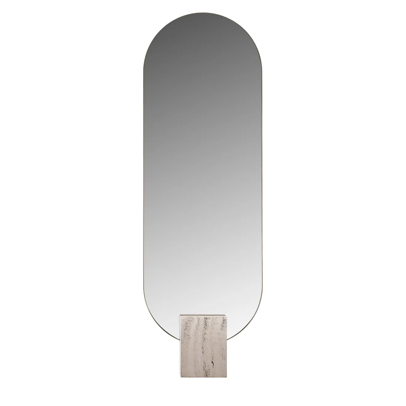Volumi minimalisti e preziosi dettagli sartoriali si uniscono per conferire a questo moderno specchio freestanding un fascino glamour. Montato su un audace blocco di travertino a poro aperto che funge da base scultorea, il vetro specchiato extrachiaro, definito da estremità arrotondate, è incastonato in una cornice di metallo dorato opaco, accoppiata a un sottile pannello di compensato per una perfetta sintesi di stabilità e leggerezza. Esplorate le varianti disponibili con il Concierge.