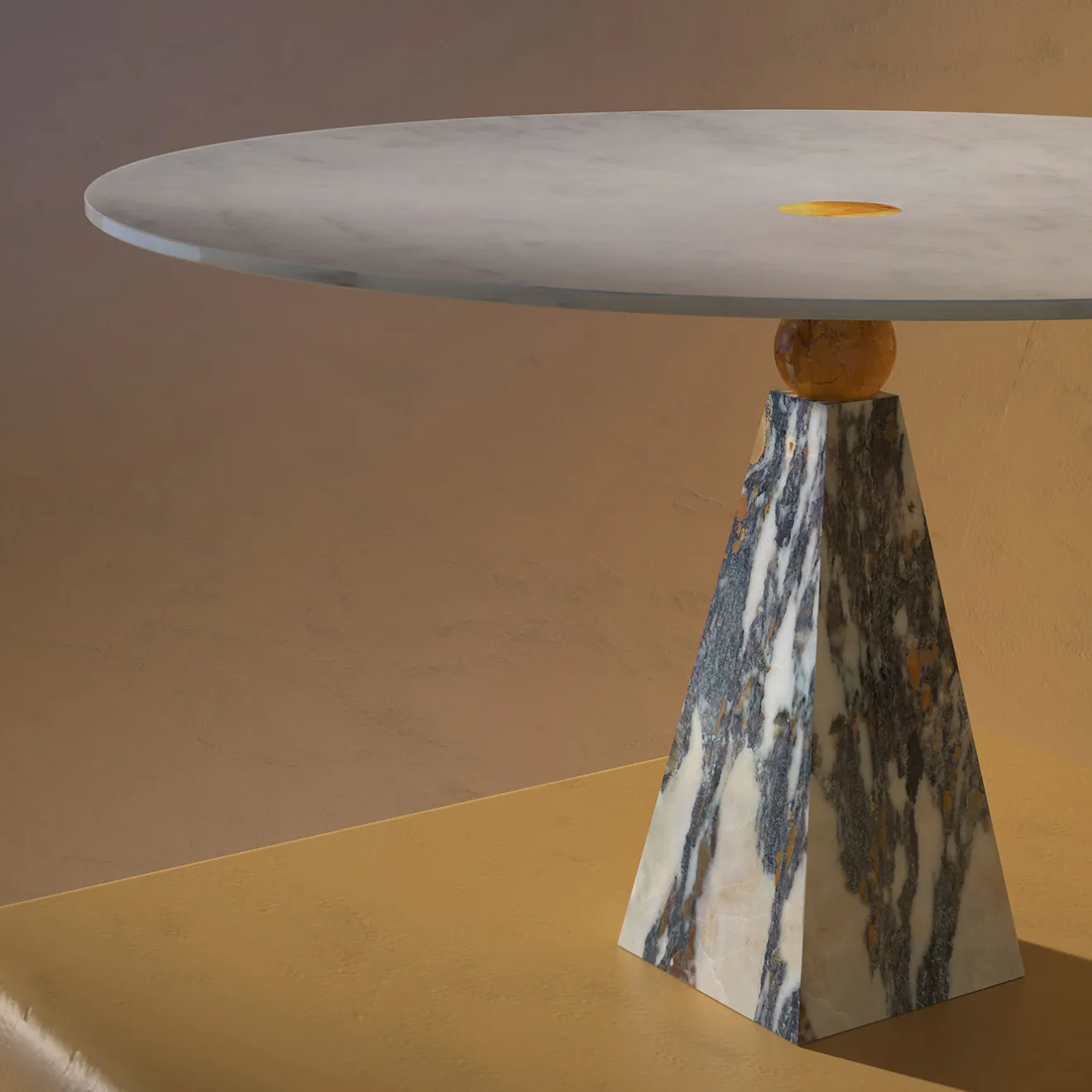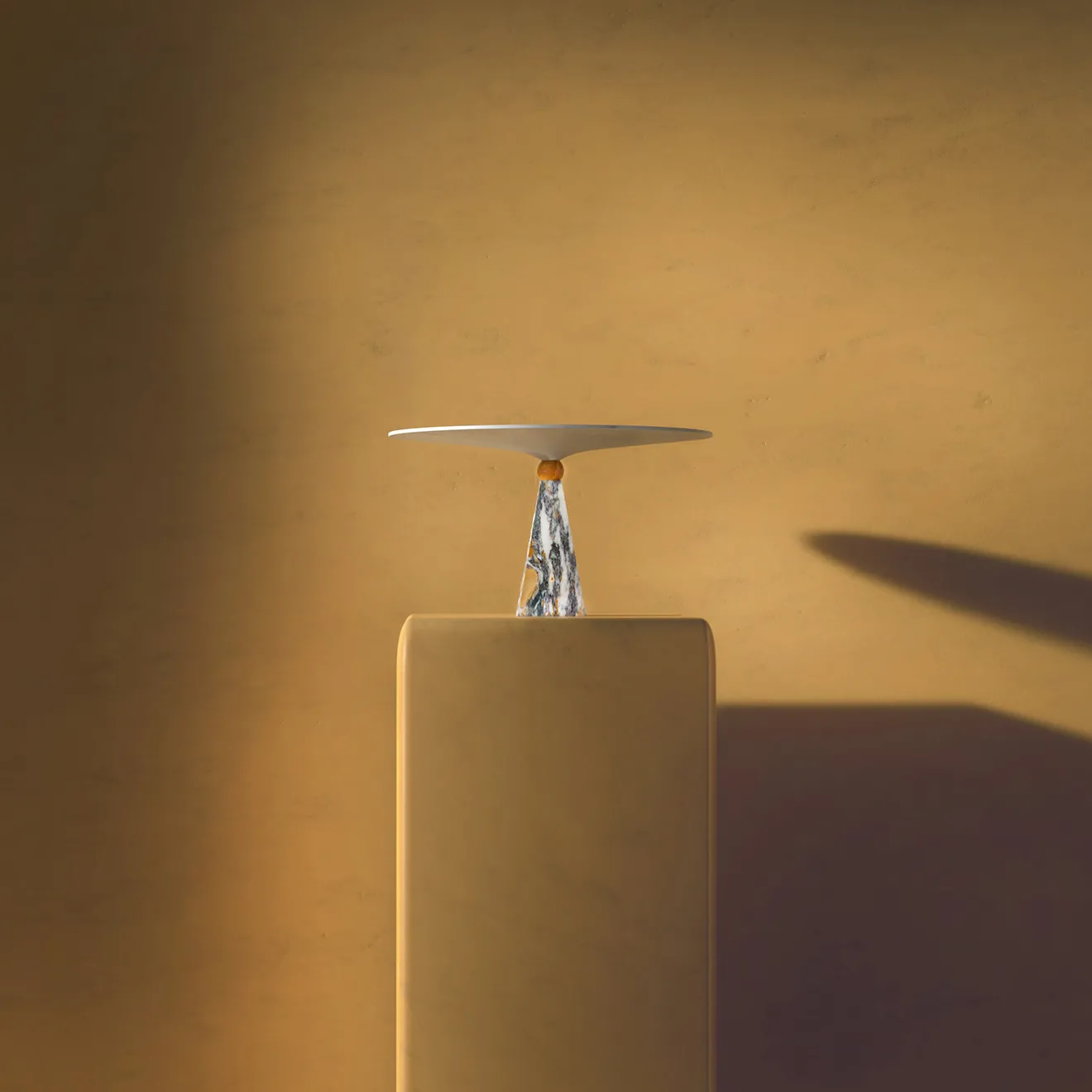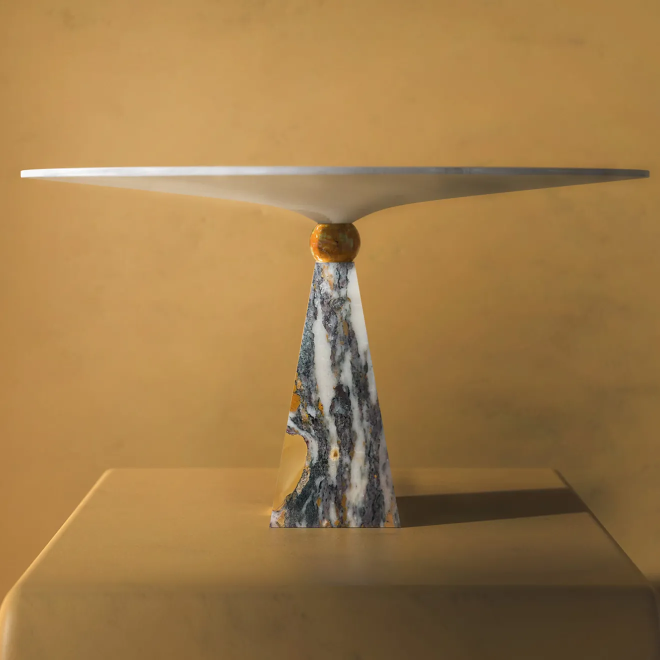 Il centrotavola Libra presenta una forma geometrica raffinata, che unisce una base a piramide tronca a un elemento sferico, sorreggendo un ampio piatto dal profilo sottile. Questa creazione scultorea trasmette un senso di grazia e leggerezza, pensata per diventare un punto focale solenne e ricercato sulla tavola. Interamente realizzata in Italia e proposta in un’elegante trilogia di colori, Libra rappresenta un omaggio sofisticato al marmo, grazie alla sua silhouette essenziale e alla precisione delle lavorazioni.