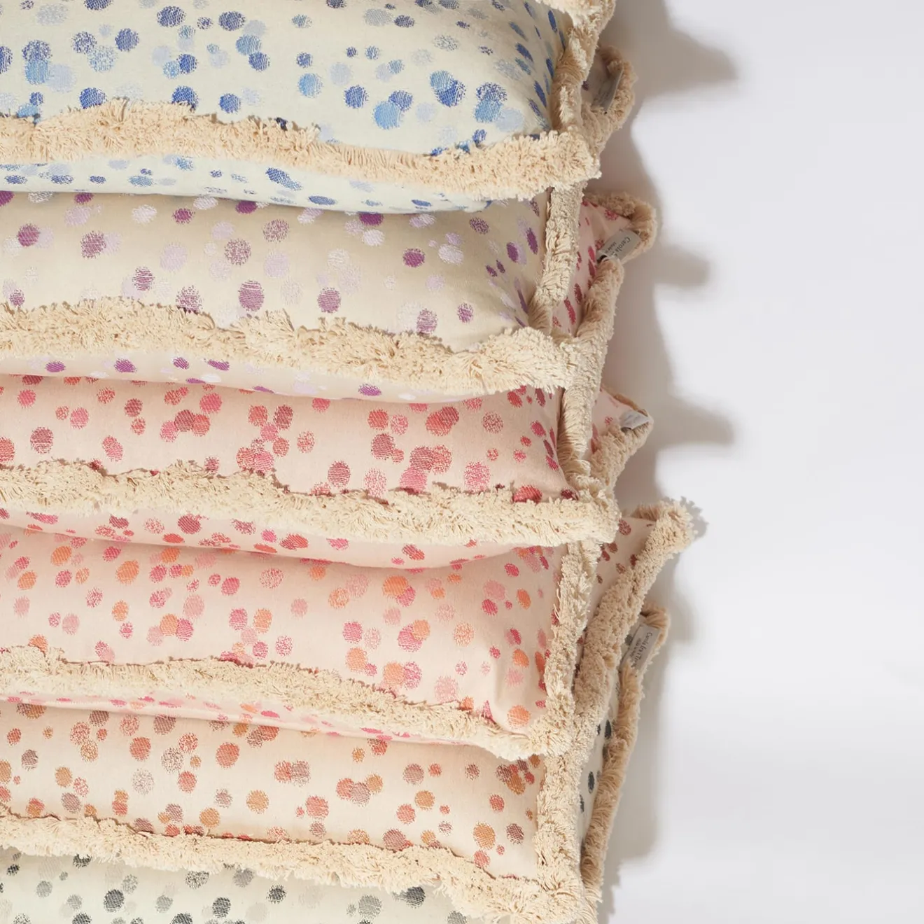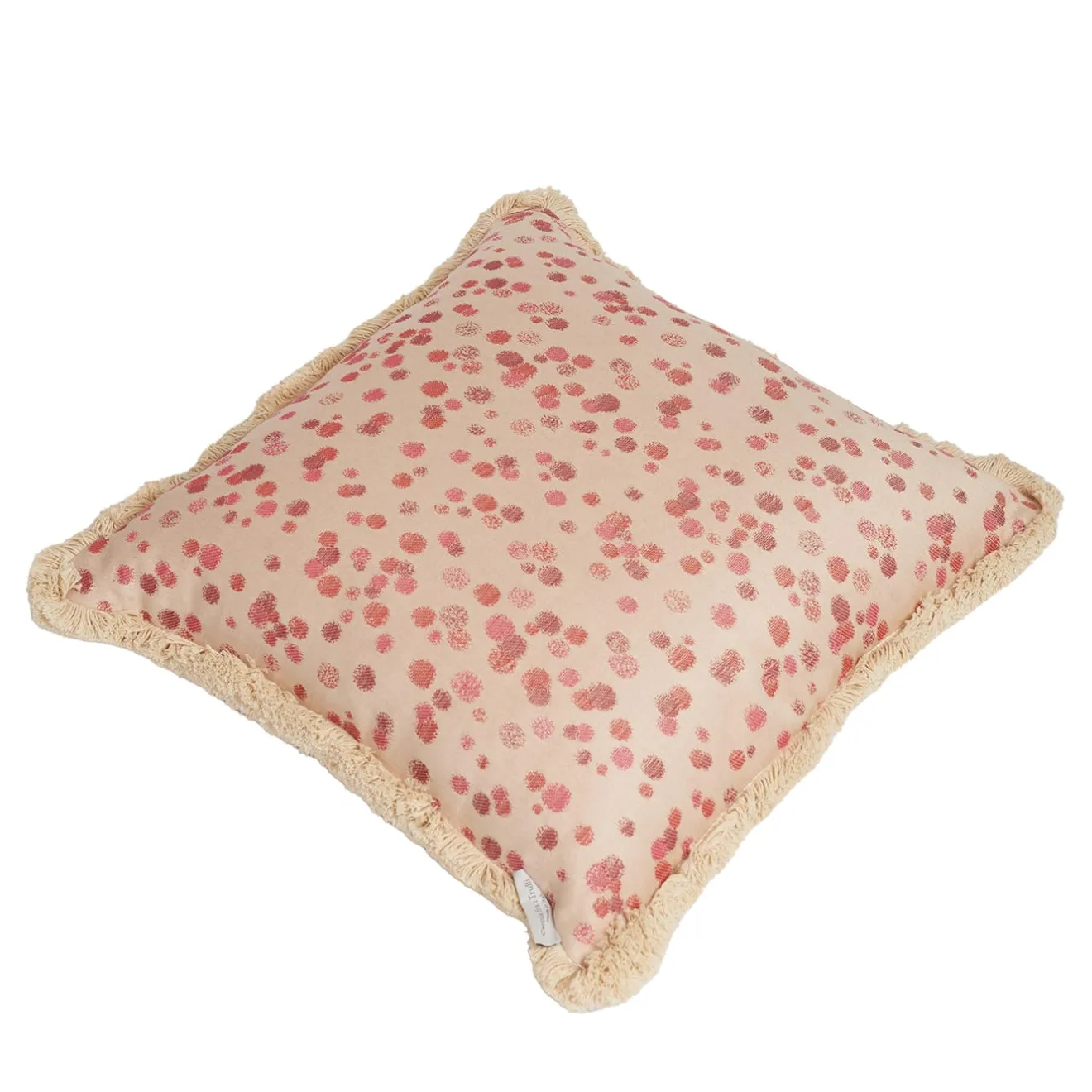 Grande cuscino decorativo di lusso in fucsia e rosso 30×50 cm in tessuto jacquard 100% cotone con bordo sfrangiato. Il suo esclusivo motivo tessile ricorda la tradizionale tecnica del macchiato pugliese, emblematica del marchio come celebrazione della gioiosa spontaneità della natura. Questo raffinato cuscino è realizzato interamente a mano in Italia e tessuto sugli antichi telai di una storica tessitura pugliese nel rispetto della storia, della natura e delle persone.