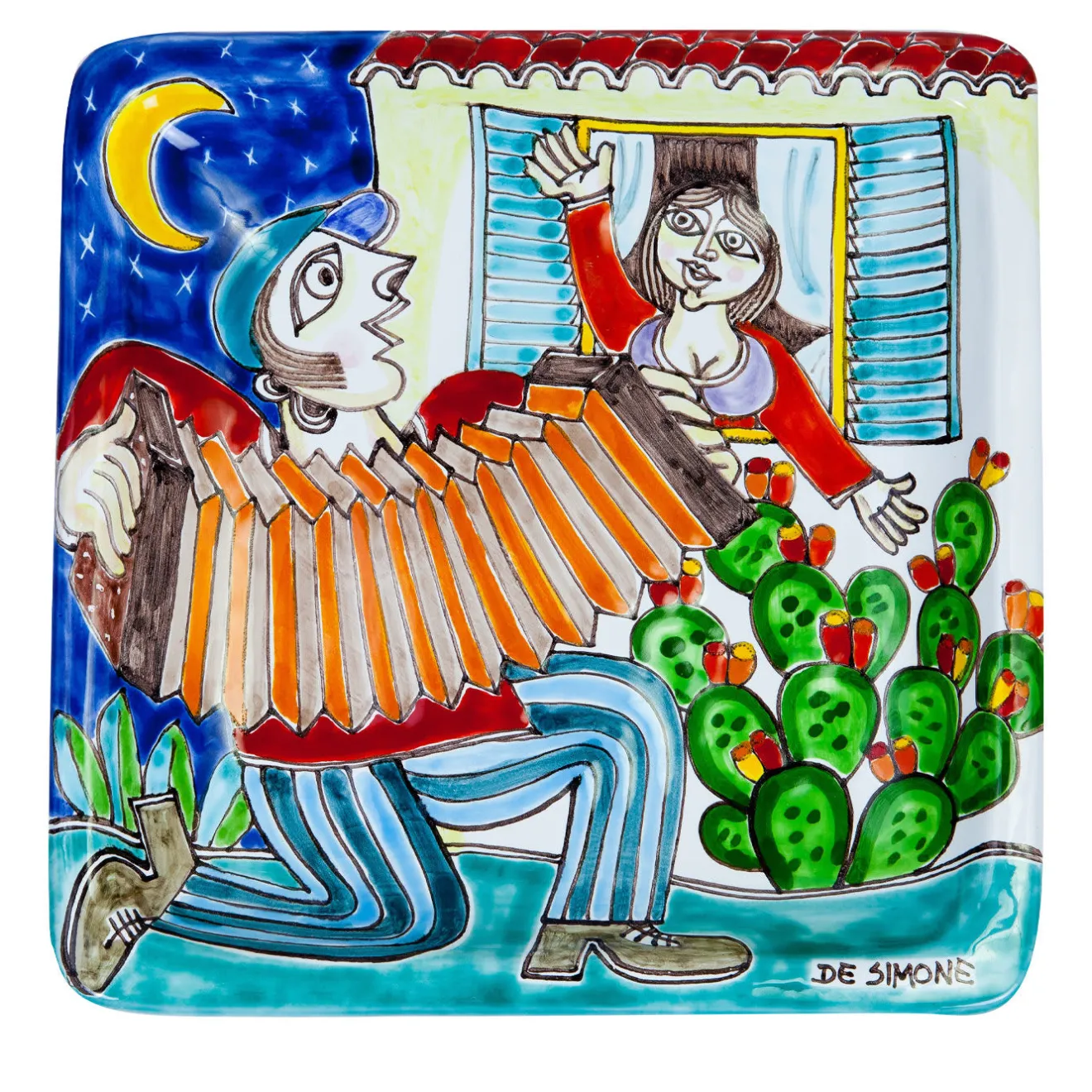 Un giovane fa una serenata alla sua amata al chiaro di luna, mentre lei ascolta dalla finestra i suoni romantici della sua concertina. Questa incantevole scena è illustrata su questo piatto ornamentale, realizzato e dipinto a mano, della collezione DS del marchio, che raffigura scene di vita siciliana tradizionale e storica. Realizzato e dipinto a mano a Palermo, Italia.