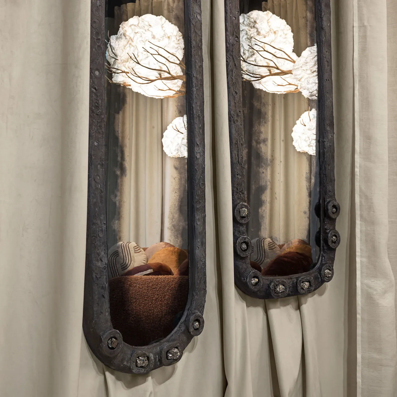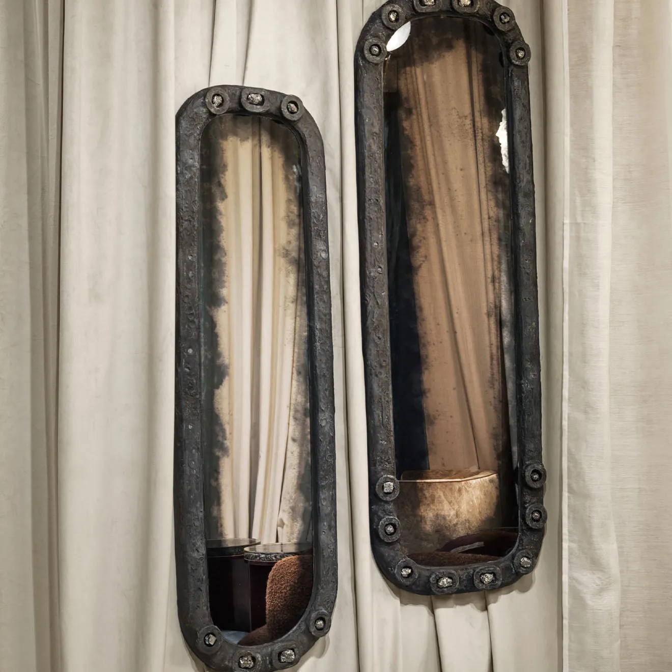 Specchio piccolo antichizzato a mano Verve presenta una cornice in gesso accentuata da inserti in pirite naturale. La forma allungata e la finitura invecchiata creano un aspetto sorprendente, ispirato al vintage, aggiungendo profondità e carattere a qualsiasi parete. Ideale per aggiungere un tocco di eleganza e una trama unica agli ambienti interni.