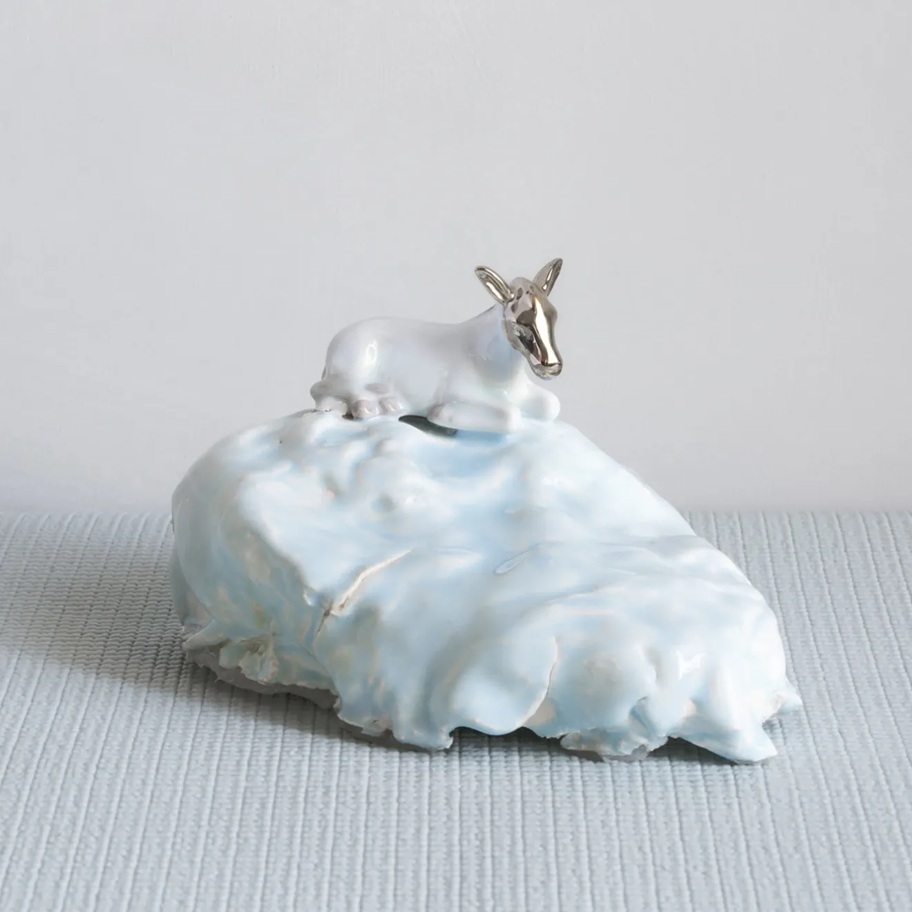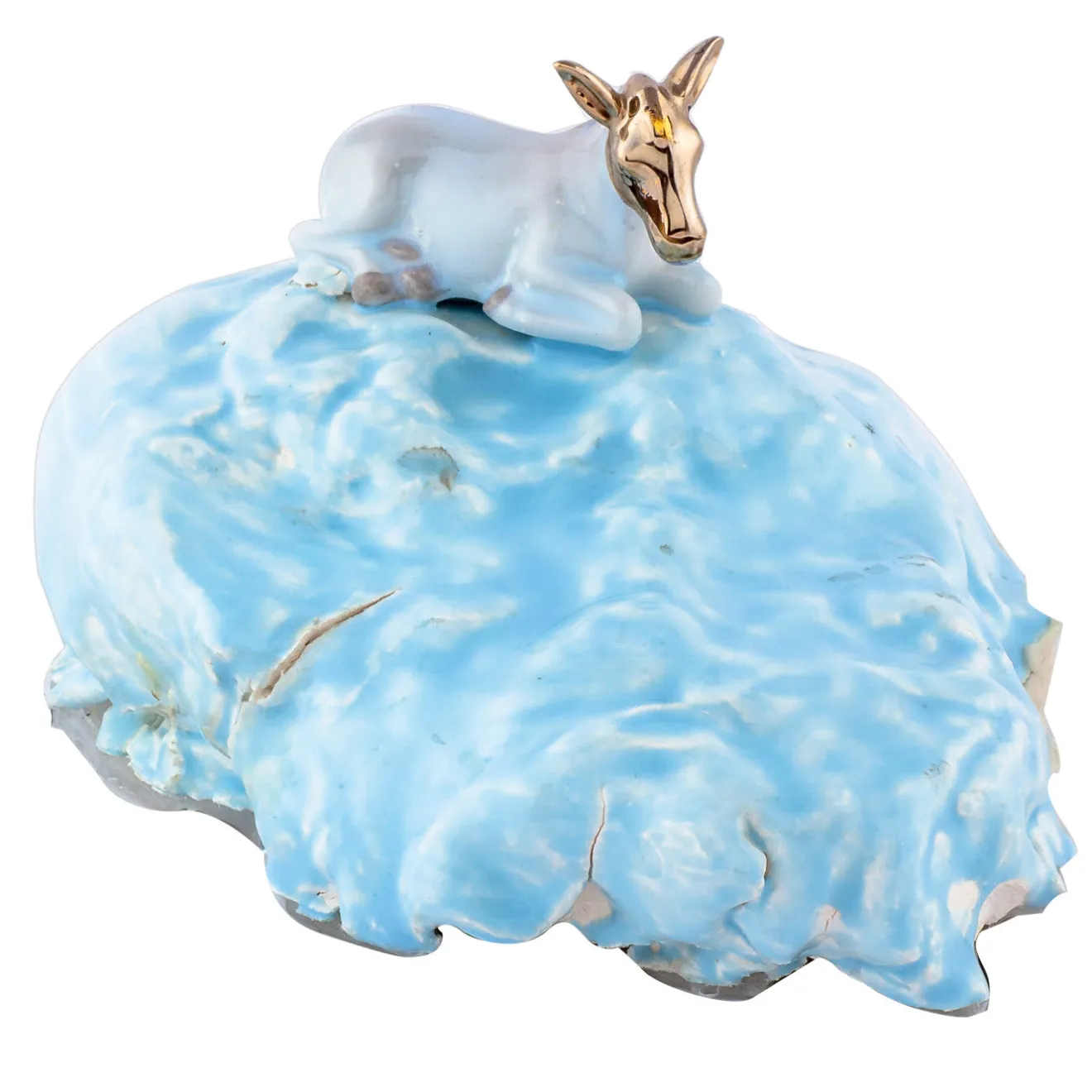 Un centrotavola affascinante crea un legame tra le persone, diventando un ottimo argomento di conversazione quando si pranza con gli ospiti. Questi pezzi eccentrici sono realizzati in totale libertà e sperimentazione, con l’aggiunta di silicone, cristalli, animali di porcellana e qualche piccolo residuo di produzione. Qui, un piccolo animale poggia su un oceano di azzurro.