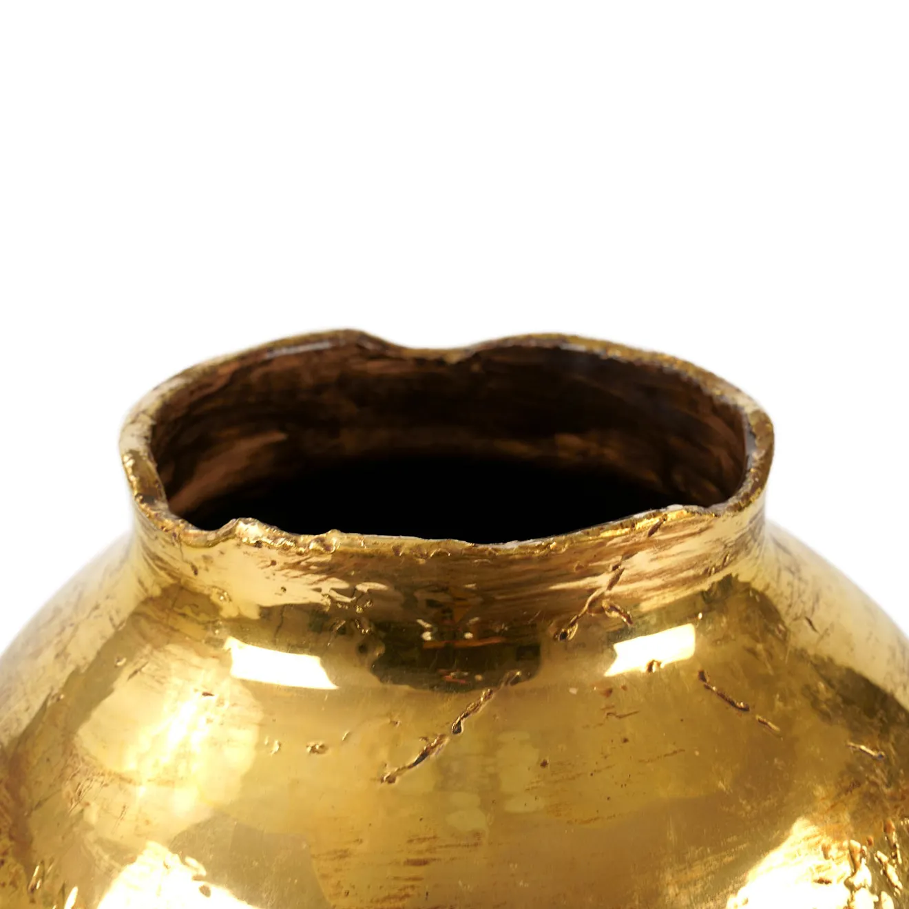 Vaso scultoreo in ceramica realizzato in pregiata argilla rossa proveniente da Sansepolcro, in Toscana. La sua forma sferica è arricchita da intricati rilievi geometrici, motivi sferici e decorazioni in bassorilievo ispirate al Rinascimento. La superficie è impreziosita da una finitura in oro puro 24 kt, applicata con la tecnica del terzo fuoco e successivamente invecchiata manualmente con una miscela naturale a base di cenere di legno di sandalo. Inciso con la firma dell’artista, il vaso esprime una straordinaria padronanza delle tecniche tradizionali di embossing. Eventuali leggere variazioni ne sottolineano l’autenticità artigianale e l’unicità.