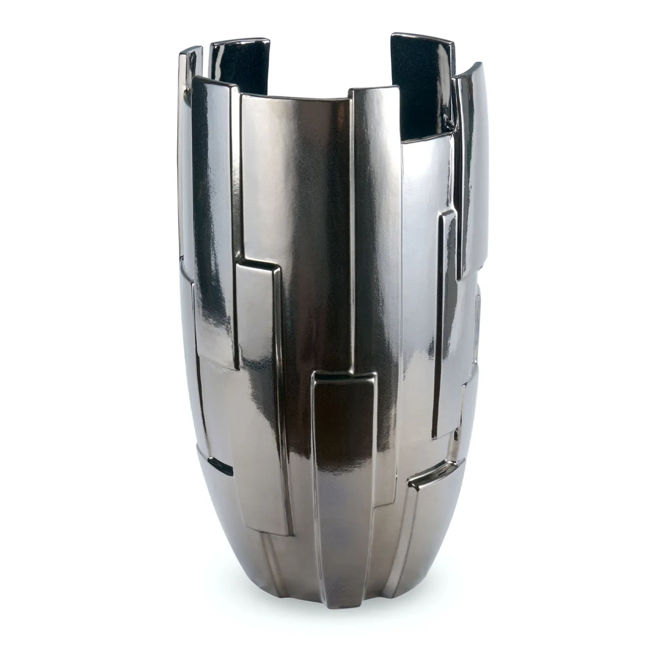 Il vaso Panoplia si distingue per un design scultoreo dinamico, caratterizzato da vuoti interconnessi e solidi sovrapposti che mutano con la prospettiva. La finitura in smalto ad alta temperatura conferisce una lucentezza speculare simile al titanio, donando un’estetica metallica ispirata alle armature. Audace e raffinato, questo pezzo bilancia forza e delicatezza, diventando un elemento decorativo unico. Ogni vaso presenta leggere variazioni che testimoniano la cura artigianale del processo.