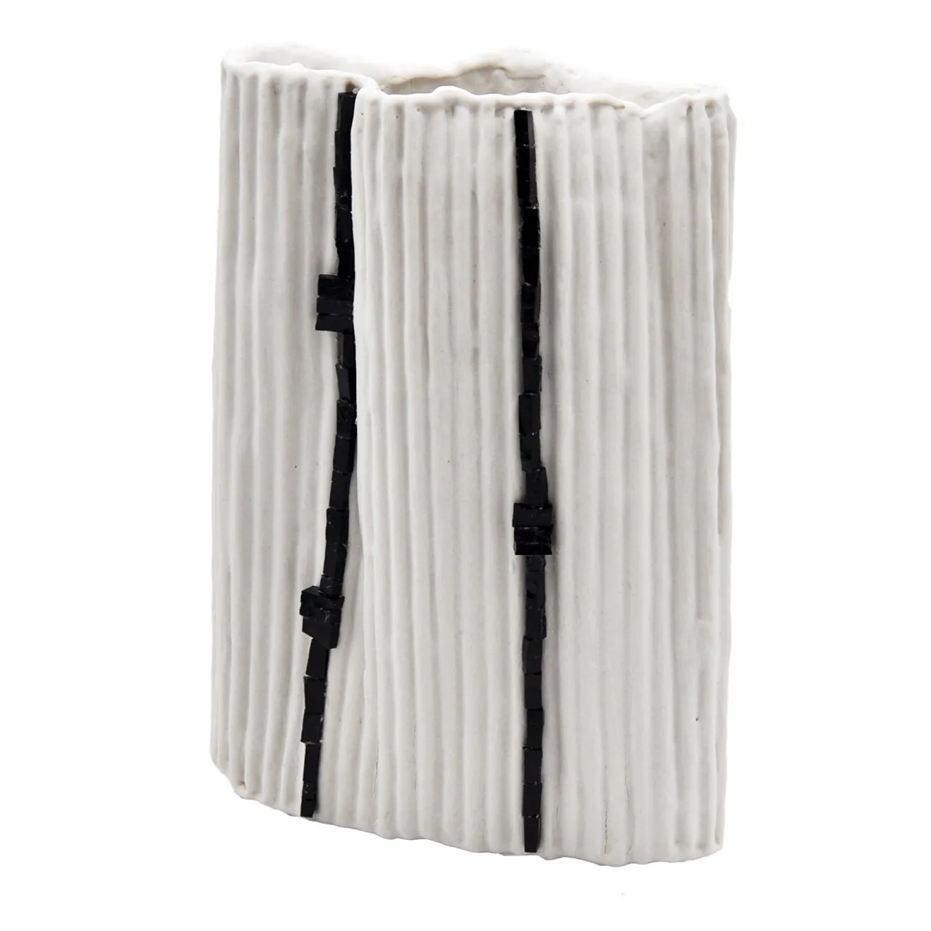 Un vaso decorativo dalla forma scultorea, caratterizzato da una superficie bianca testurizzata con voluta ruvidità. Due bande verticali di tessere in smalto veneziano nero lucido, tagliate e applicate con meticolosa precisione, creano un suggestivo contrasto di texture e luminosità. Parte della collezione Paesaggio sotto la luna, questo pezzo contemporaneo in ceramica si adatta perfettamente ad ambienti moderni, minimalisti e artistici. Include confezione, certificato di autenticità e istruzioni per la cura.