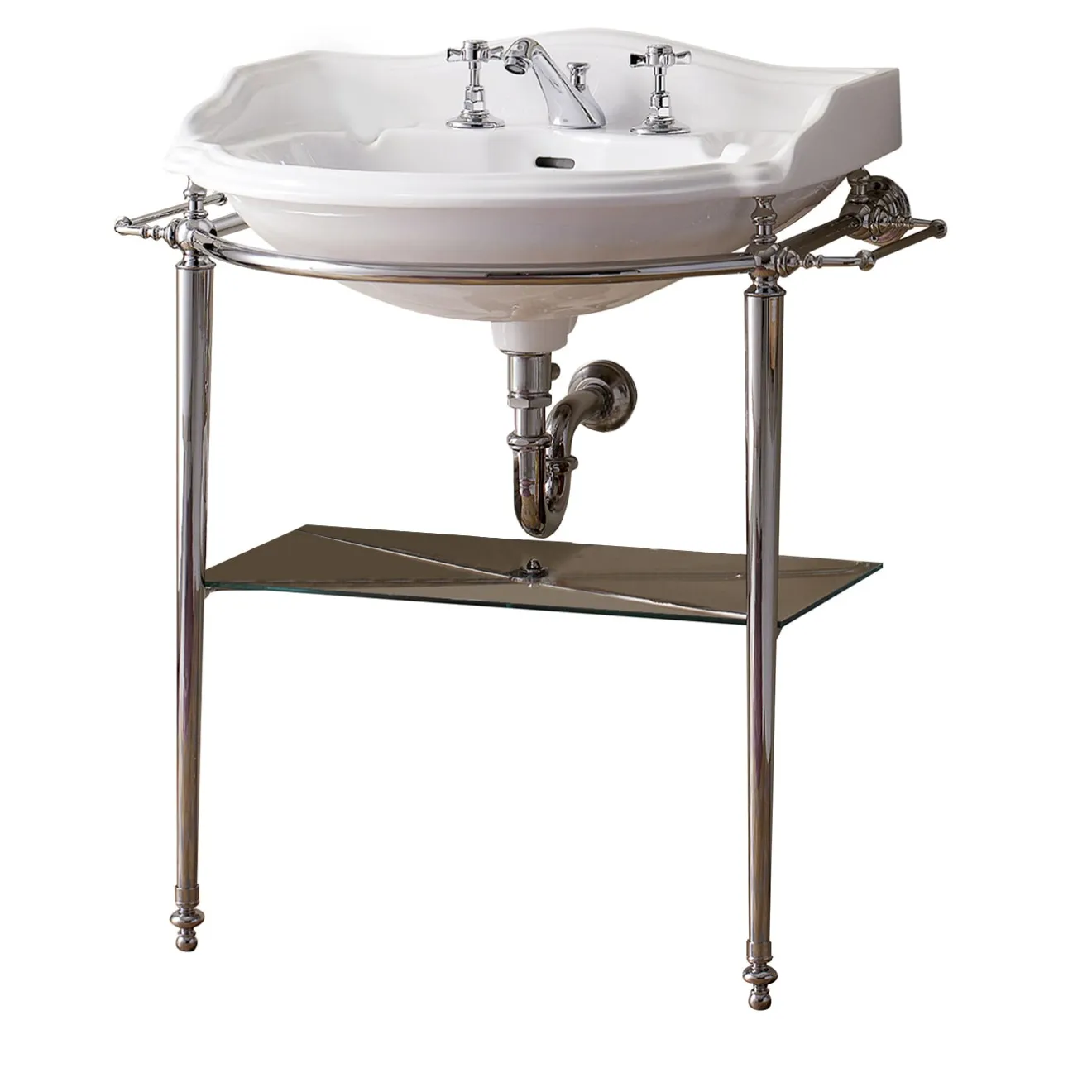 Una consolle di ispirazione classica con un raffinato lavabo Oxford in ceramica bianca e un comodo ripiano in vetro. La struttura in ottone, con portasciugamani, è in finitura cromata. Disponibile anche in altre finiture, chiedere al concierge per ulteriori informazioni e opzioni. La rubinetteria non è inclusa.