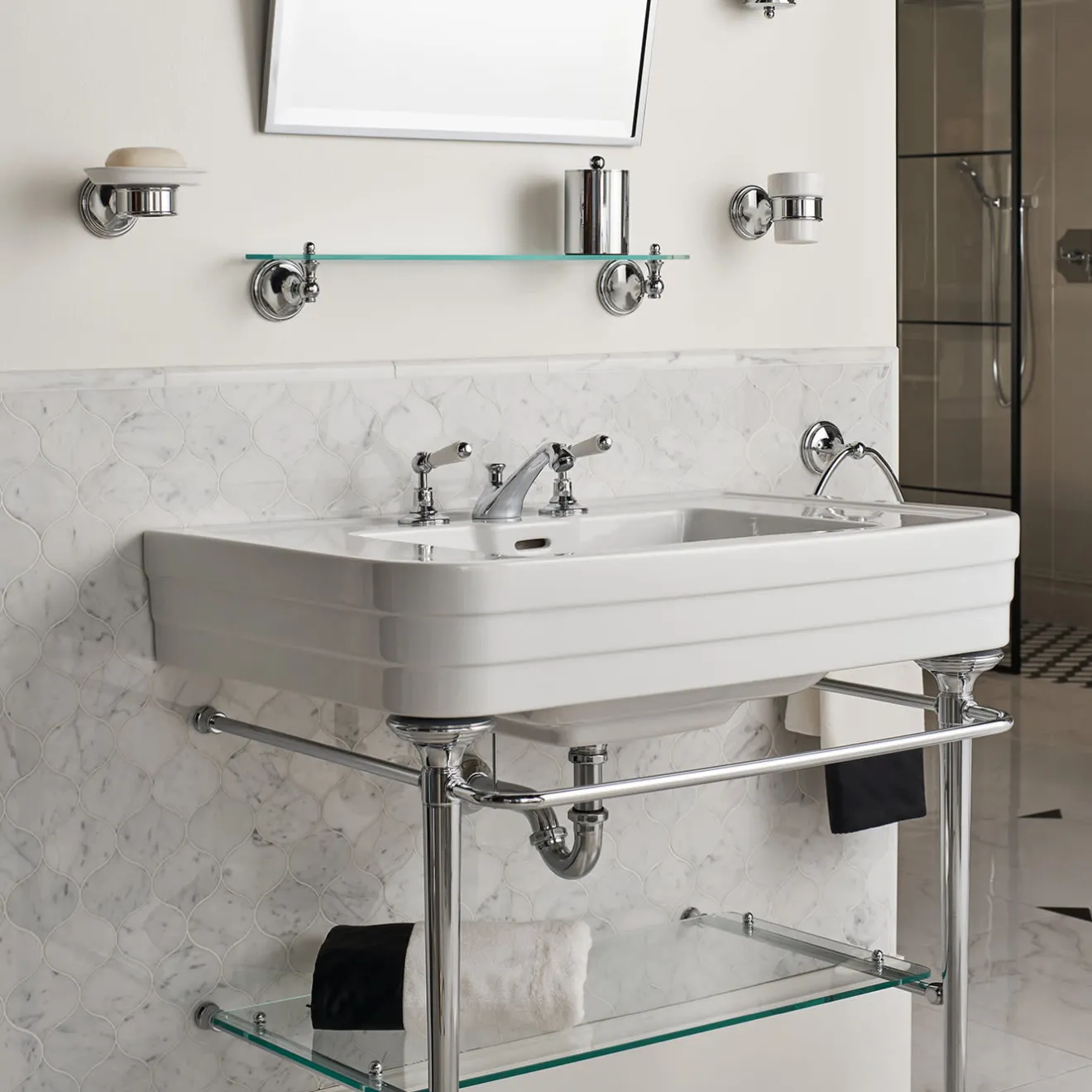 Una raffinata consolle che distilla l’estetica dell’architettura Art Déco e la rilegge all’insegna del comfort più esclusivo. La struttura in ottone, con terminali di appoggio con modanatura tripartita che richiamano la conformazione scultorea del lavabo in ceramica, include tre barre porta-asciugamani e una mensola porta-oggetti in vetro. La rubinetteria non è inclusa. Contattare il Concierge per ulteriori informazioni e opzioni.