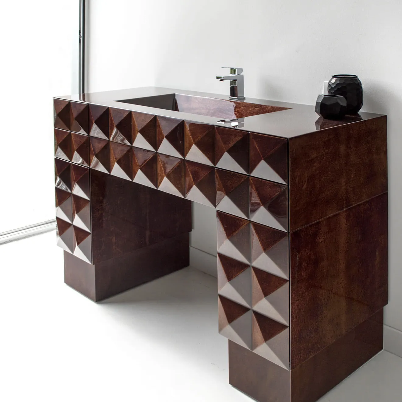 Questo raffinato insieme da bagno disegnato da Giannella Ventura è interamente realizzato in pergamena con una ricca tonalità moka. Realizzato per resistere ai rigori dell’umidità e dell’esposizione all’acqua, è sinonimo di durata e resistenza. Grazie ai cassetti e alle ante con apertura a pressione, la praticità incontra la raffinatezza senza sforzo. L’accattivante facciata frontale crea un’incantevole illusione ottica grazie a un intricato mosaico di piccole forme piramidali quadrate. Rubinetteria inclusa, come da immagine.