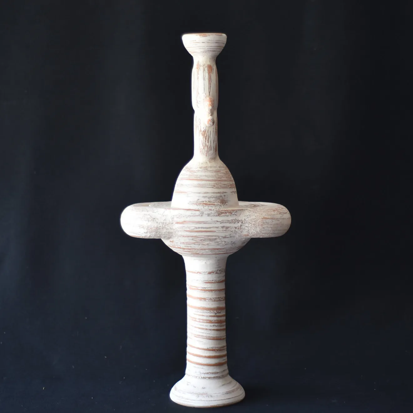 L’ispirazione zoomorfa di questa raffinata scultura in terracotta è un feroce gallo. Realizzata e modellata a mano al tornio, la silhouette stilizzata è ottenuta grazie a una sapiente combinazione di volumi rotondi, distribuiti in modo da rendere le specifiche parti del corpo dell’animale, ravvivandolo con un’intensa armonia scultorea. Lo splendido rivestimento è costituito da più strati di argilla liquida applicati sulla terracotta con la tecnica dell’ingobbio.
