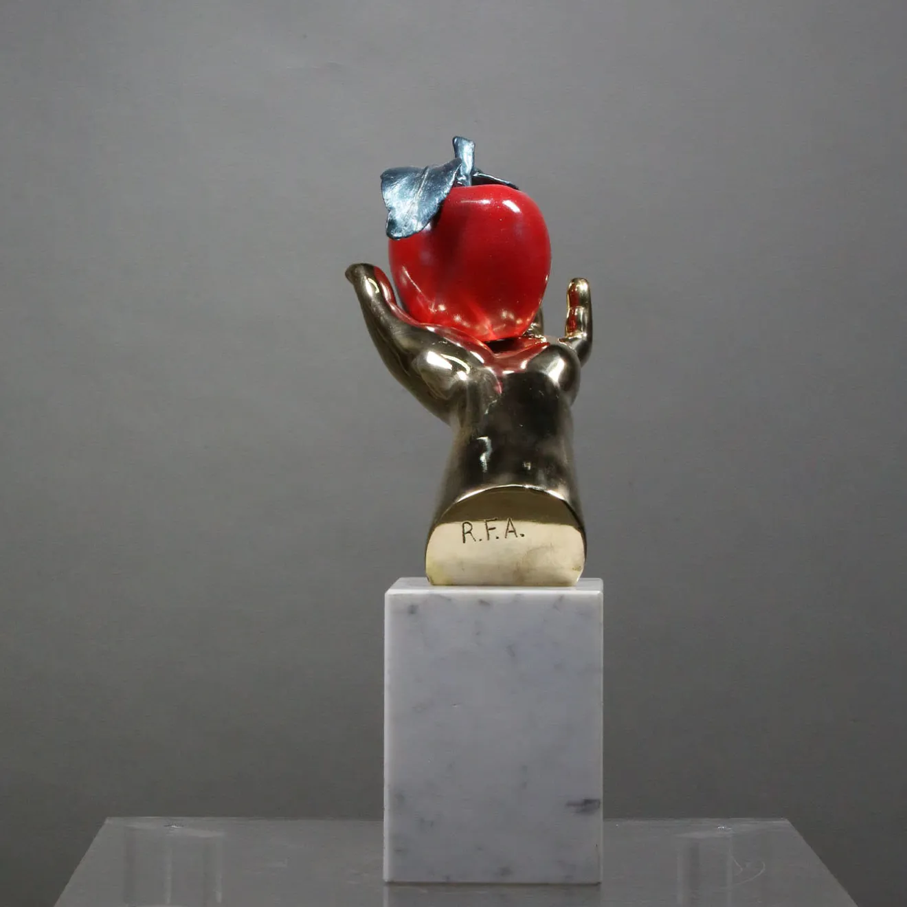 Sapientemente realizzata con l’antica tecnica della fusione a cera persa, questa preziosa scultura in bronzo colpisce per il suo soggetto semplice e colorato. Una luminosa base in pregiato marmo bianco sostiene il braccio spazzolato all’estremità del quale si trova una vibrante mela rossa. Inconfondibilmente contemporaneo, il pezzo è disponibile anche nelle varianti con marmi verdi e neri.