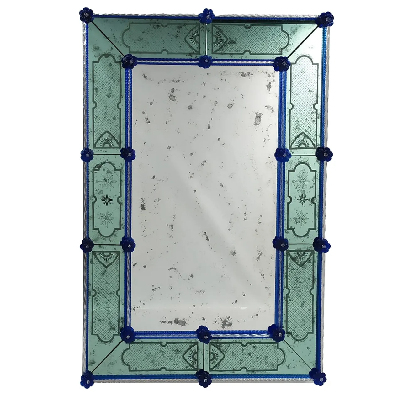 Questo mobile è una riproduzione del tipico specchio veneziano antico in vetro di Murano rettangolare, argentato con argentatura antica prodotta interamente a mercurio. Questa tecnica è tipica del Settecento veneziano. La cornice interna ed esterna è realizzata in bacchette di cristallo di Murano su fondo argentato. Le delicate finiture degli angoli sono decorate con fiori di cristallo blu, tutti anticati, secondo le antiche tecniche e tradizioni muranesi.