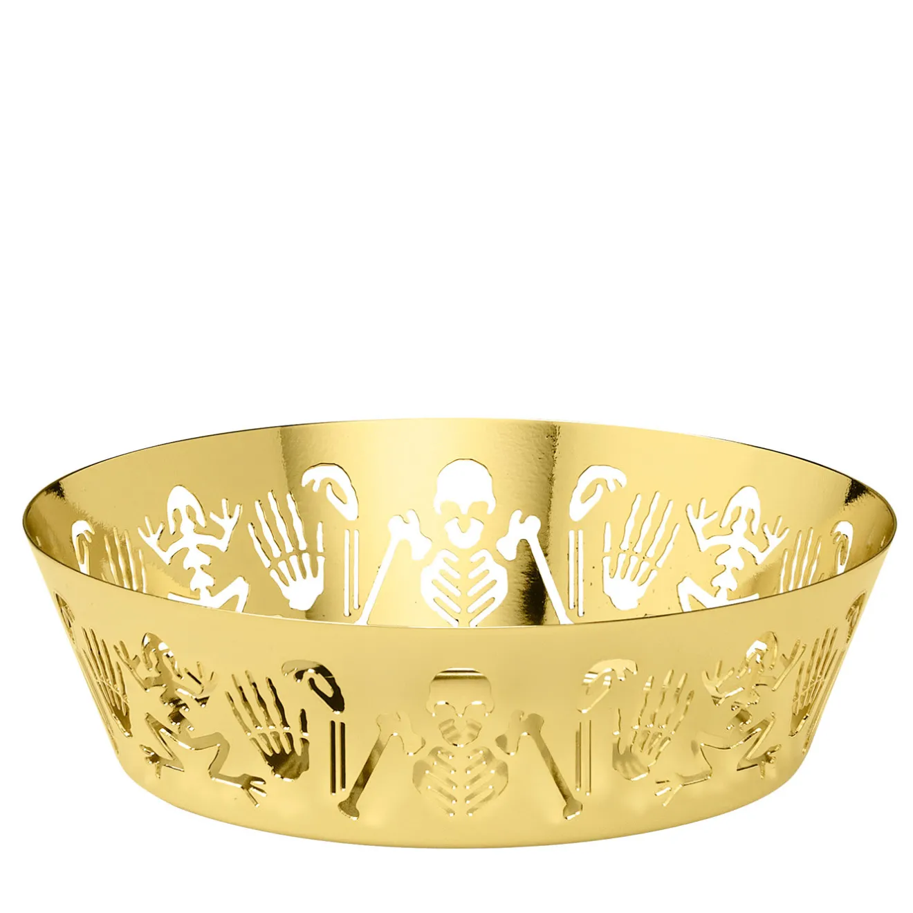 Parte della Collezione Perished, questa piccola ciotola è un superbo esempio di squisita fattura e sensibilità contemporanea. La forma svasata della ciotola è interamente realizzata in ottone e vanta una decorazione a intaglio che corre lungo i lati con scheletri danzanti di uomini e rane. Giocoso e sorprendente, questo pezzo sarà un ottimo espositore per piccoli oggetti su una console o una ciotola individuale per abbellire un tavolo moderno con un tocco unico. È possibile combinare questo pezzo con altri della stessa serie per ottenere un’estetica coesa.