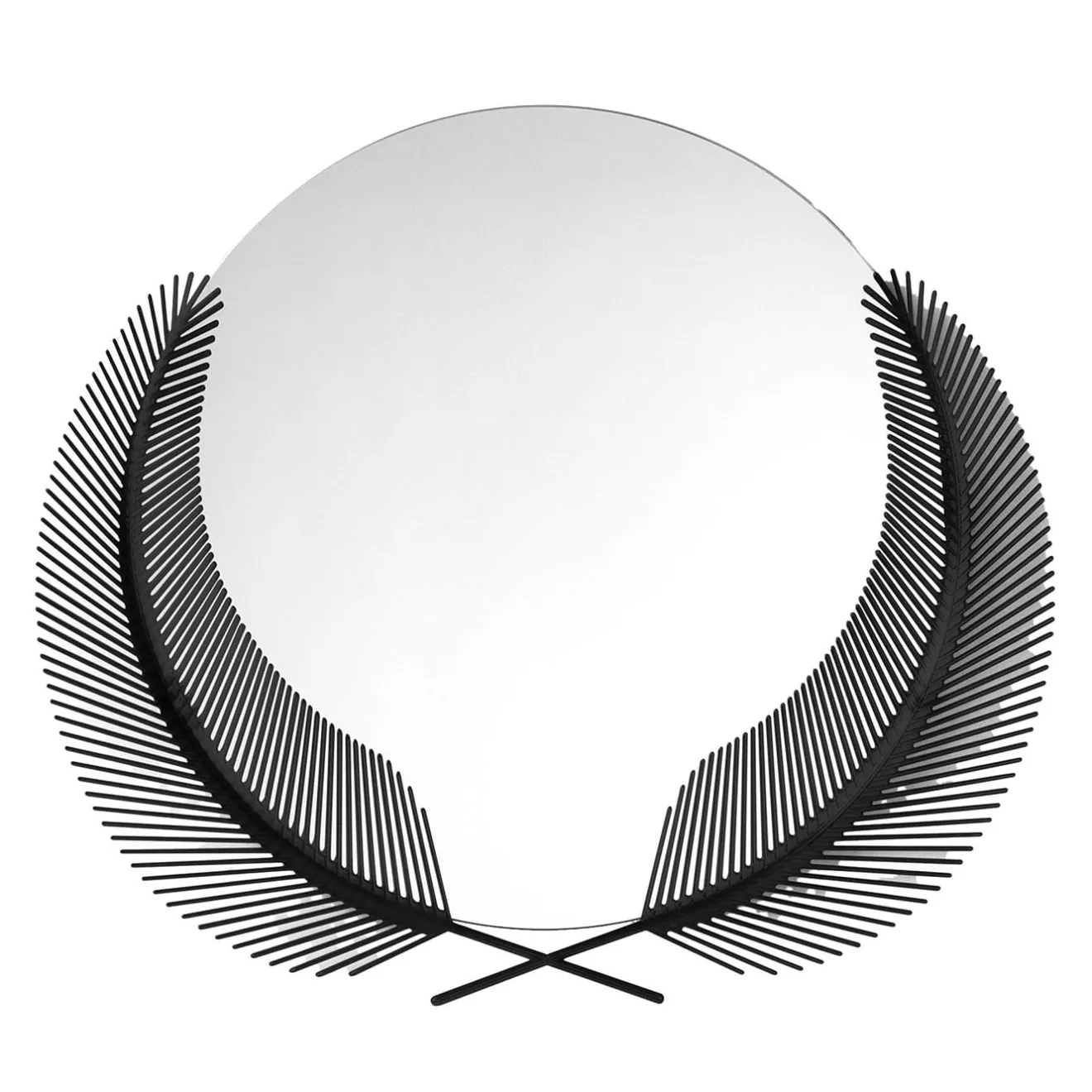 Evocando antichi simboli e paradisiaci scenari caraibici, questo specchio rotondo affascina per il suo design eloquente ma semplice. Una coppia di fronde di palma in ottone nero incornicia il pezzo, offrendo uno scorcio tropicale cui fa eco la forma rotonda che ricorda il sole. Sofisticato e armonioso, è un complemento perfetto per gli arredi contemporanei.