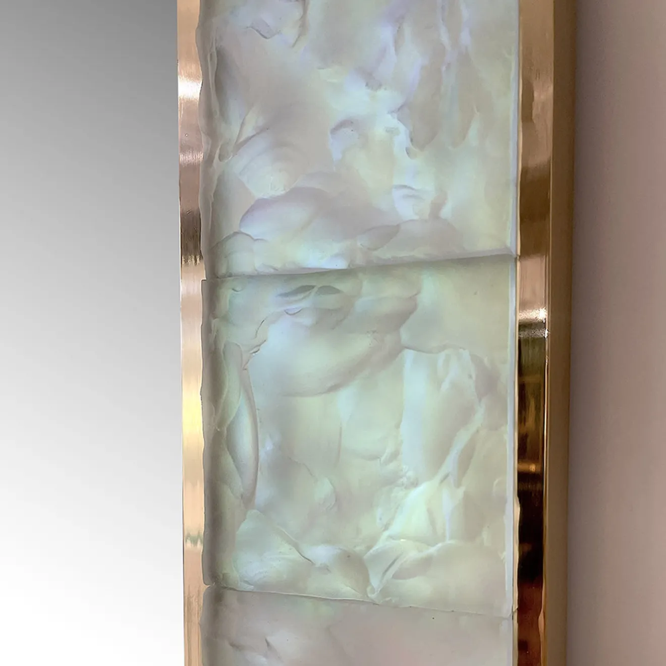 Grande specchio da parete rettangolare con cornice in ottone lucido. La struttura sostiene una serie di tessere di vetro quadrate disposte lungo tutti i bordi dello specchio. Ogni vetro è stato interamente scolpito a mano e ha una finitura opalescente che cambia a seconda della luce e del punto di vista, riuscendo ad assumere tutti i toni freddi dell’arcobaleno.