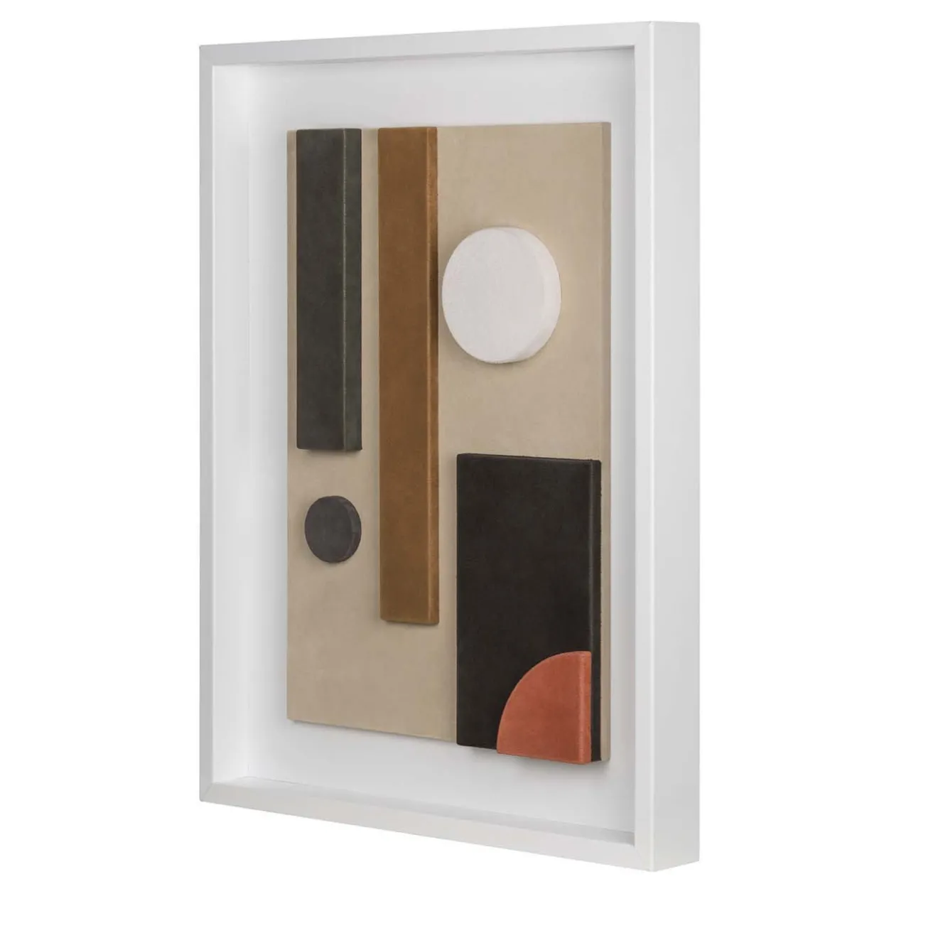Per conferire a qualsiasi ambiente una presenza rifinita e lucida, questa scultura da parete è un design esclusivo di GioBagnara, realizzato interamente in pelle di forma rettangolare. Disponibile in una serie limitata di motivi astratti in morbida pelle scamosciata e con una cornice in nappa bianca o nera, questo pezzo presenta uno sfondo beige con una serie di forme geometriche in marrone, ocra, bianco e nero che ricordano l’arte astratta modernista. Questo splendido oggetto da collezione sarà un regalo apprezzato in ogni occasione.