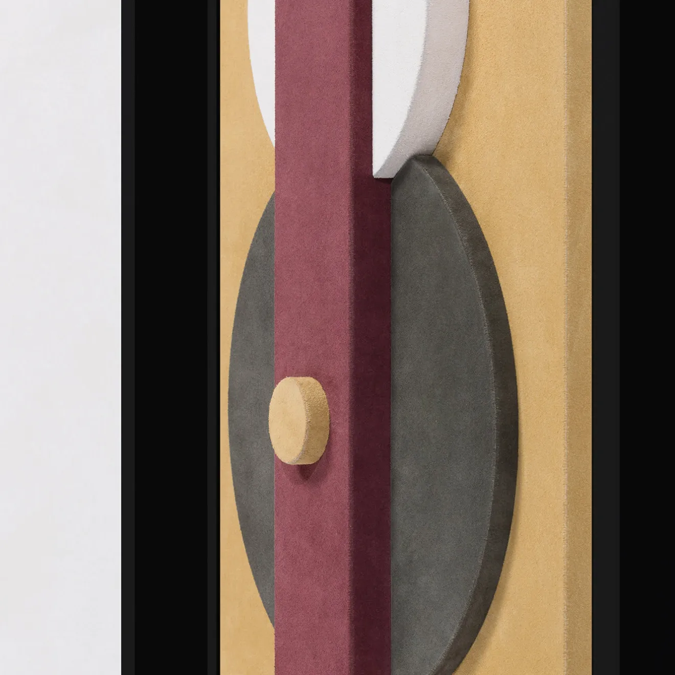 Racchiusa in una cornice interamente rivestita in nappa nera, questa scultura decorativa da parete unica nel suo genere è composta da forme geometriche pure di colori diversi disposte in stile astratto. Parte di una serie numerata, questo espositore presenta un piccolo cerchio bianco sovrapposto a uno più grande in nero a contrasto su uno sfondo color ocra. Al centro è sovrapposto un listello rettangolare rosso, accentuato da un piccolo punto ocra che evoca visivamente lo sfondo. Questa composizione astratta è interamente realizzata in morbida pelle scamosciata per un’elegante combinazione di texture e colori con la cornice nera.