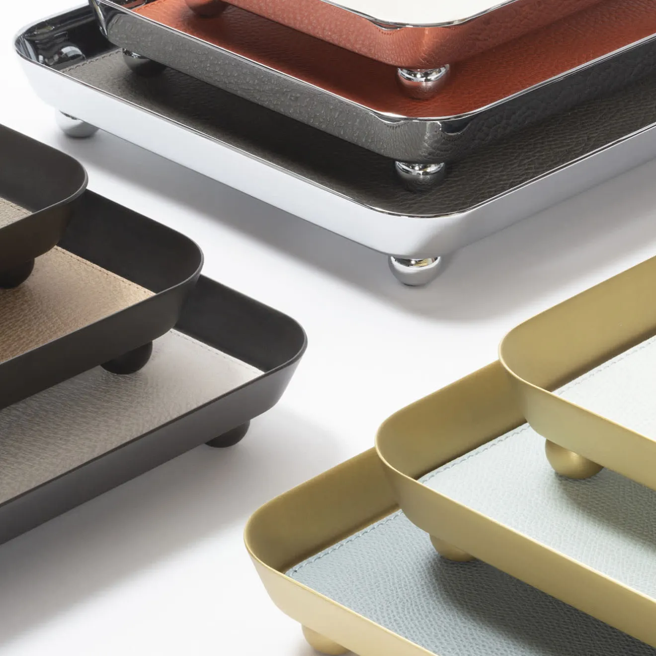 Struttura in metallo con piedi arrotondati in metallo disponibili in diverse finiture. Fornito di tovaglietta in pelle rimovibile. Finiture del metallo disponibili: cromo/bronzo/ottone.