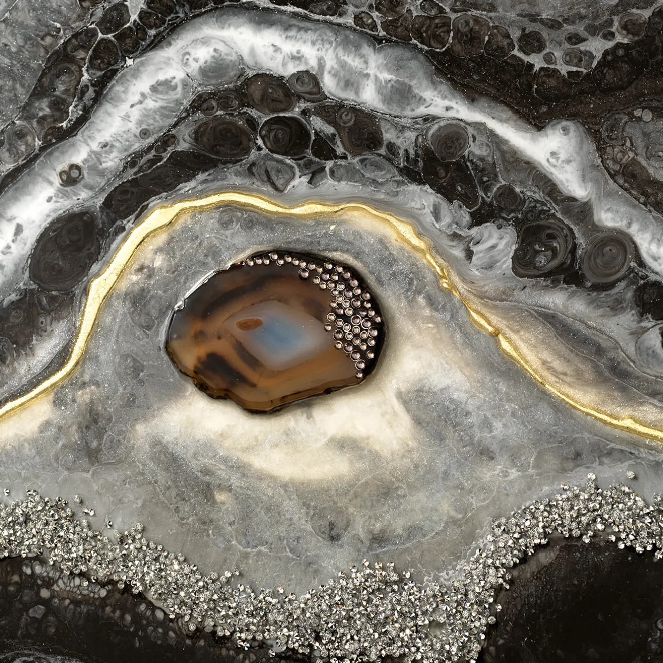 Scoprite questo quadro rettangolare in una struttura di legno con telaio in acciaio inox. Base in resina epossidica con protezione UV in combinazione con cristalli “Swarovski”, pietre di agata e foglie d’oro.