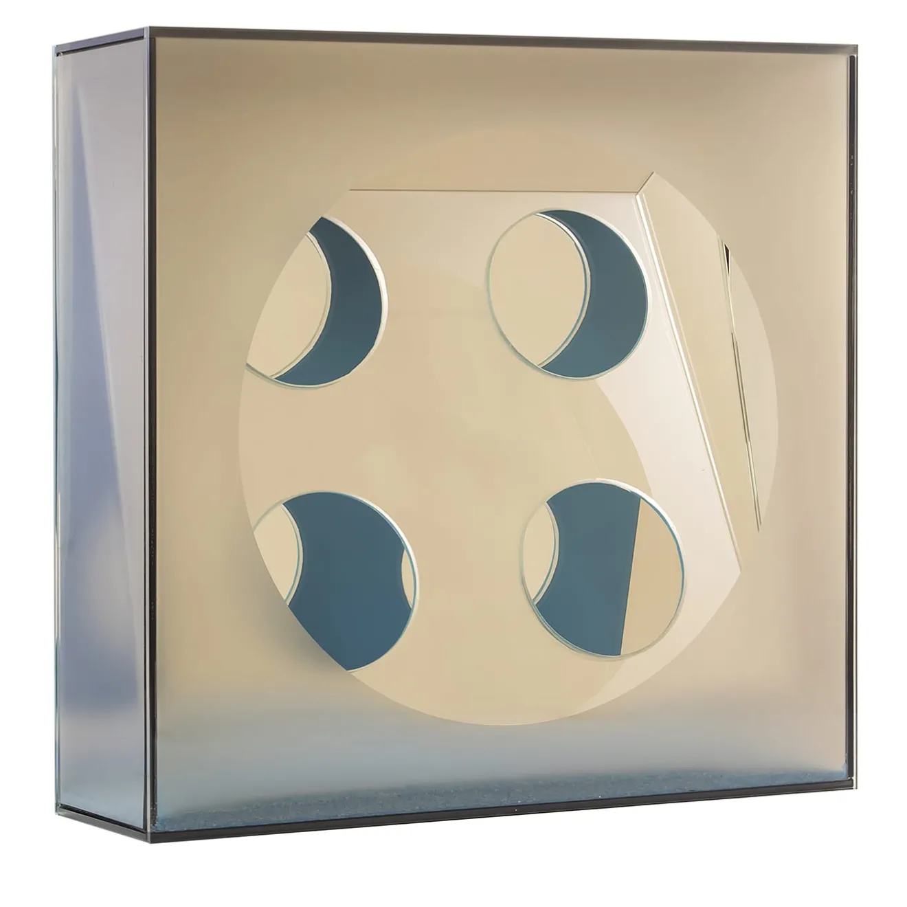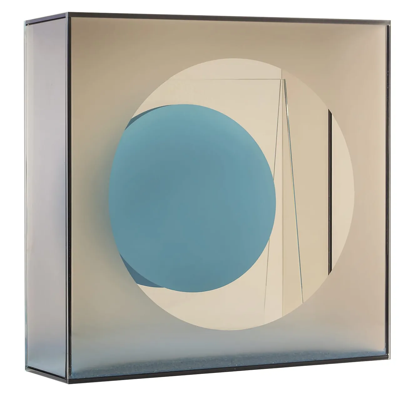Un’illustrazione tridimensionale che prende volume e forma attraverso zone in luce e altre in ombra. La decostruzione dei riflessi su più livelli si definisce grazie all’alternanza calibrata di aree trasparenti, riflettenti, satinate o laccate, tutte collocate su un fondo di sabbia colorata che richiama le origini del vetro.