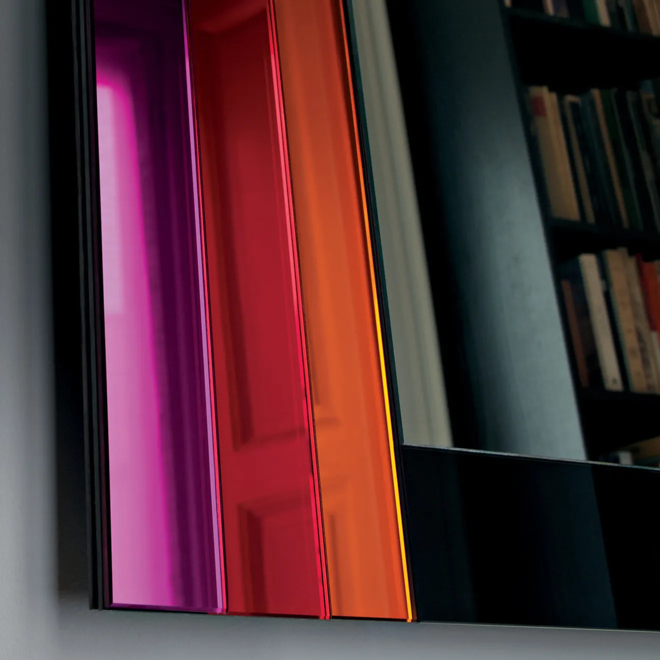 La collezione Gli Specchi di Dioniso disegnata da comprende sei specchi di diverse forme e dimensioni caratterizzati da cornici policrome. Perfetta per aggiungere un tocco di stile e vivacità a qualsiasi interno dominato da una palette neutra o monocromatica, questa versione numero 3 vanta uno specchio rettangolare incorniciato da sottili lamelle rettangolari di vetro laccato lucido e specchio colorato laminato.