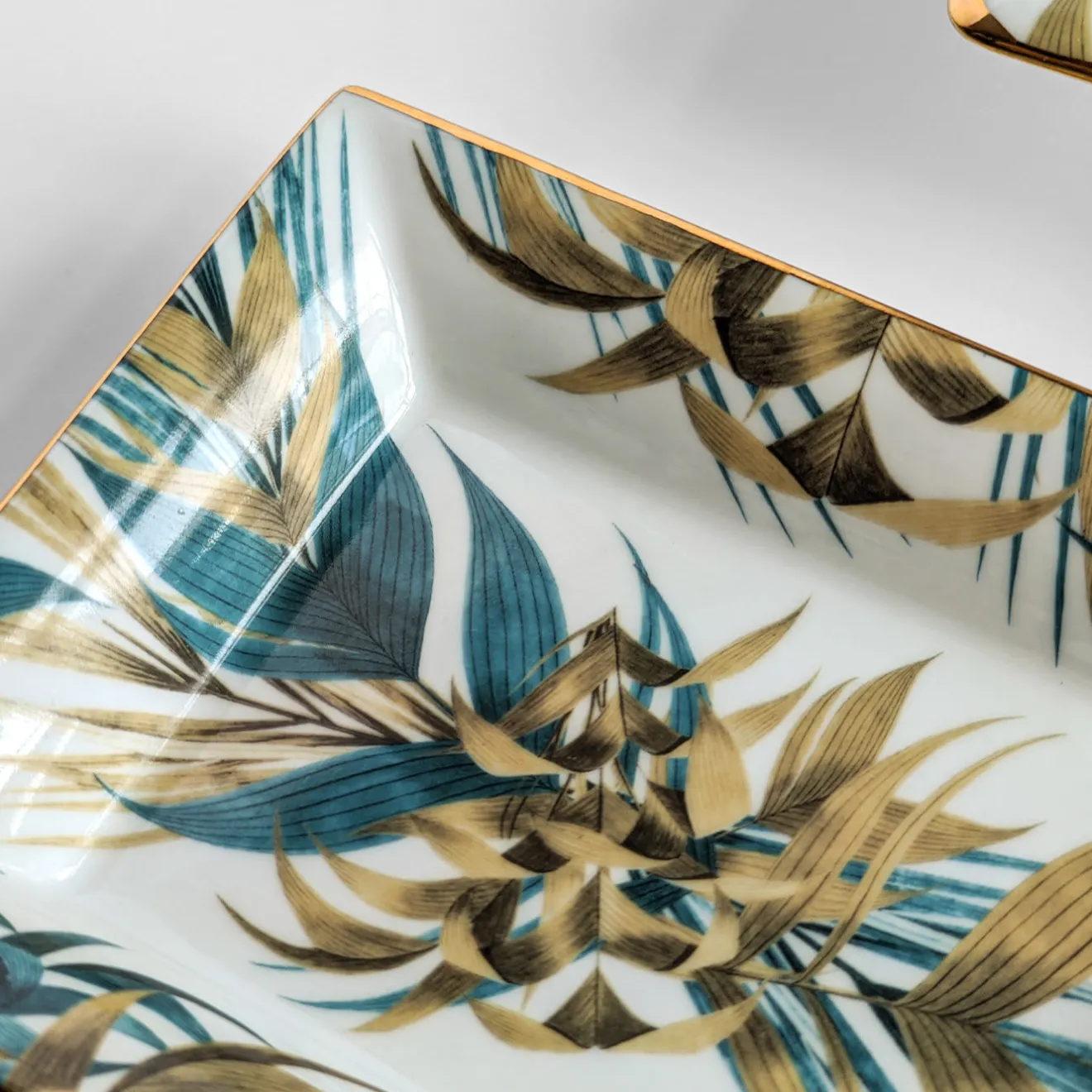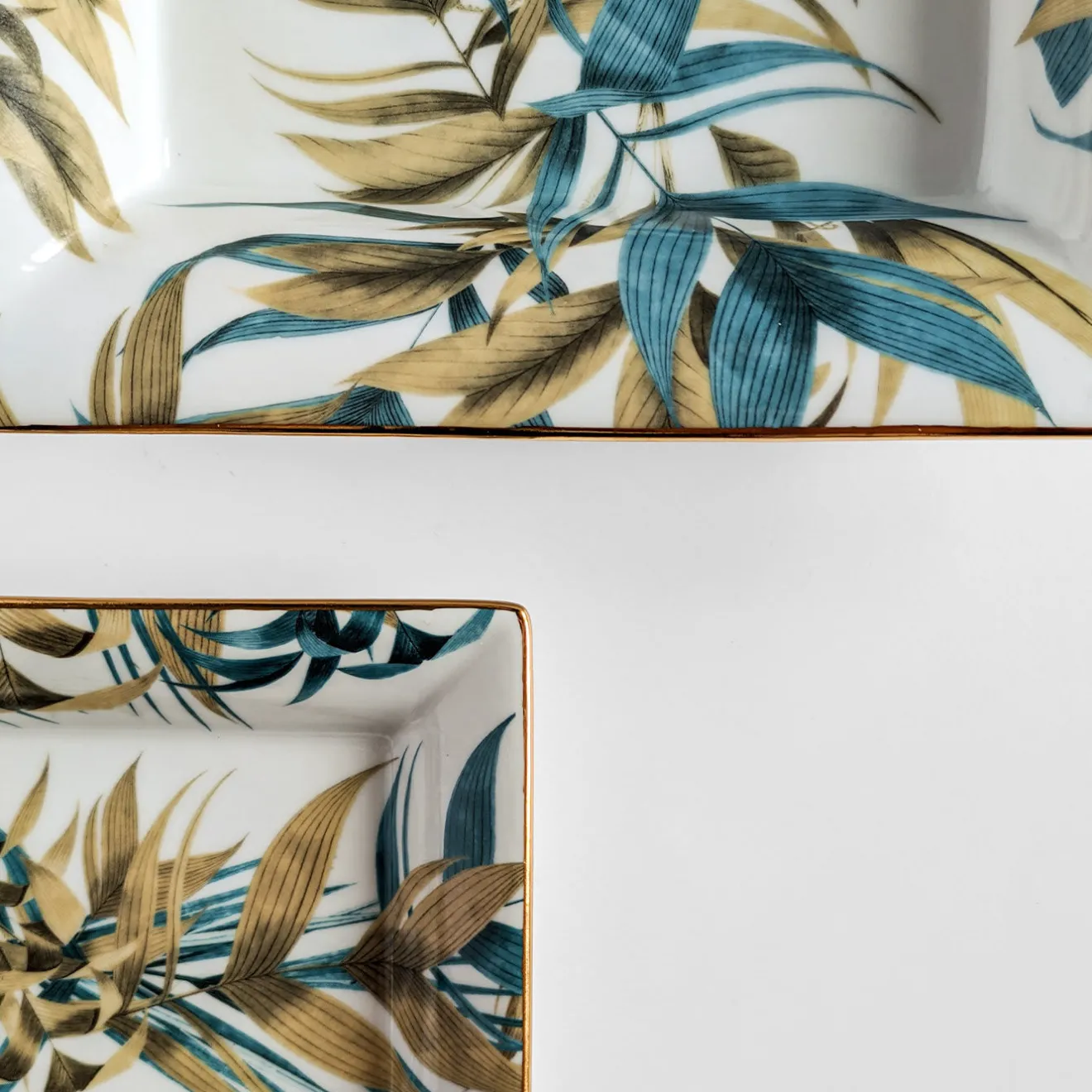Questo straordinario set di porcellana composto da posacenere (cm 15 x 11,5 x 2,5 H) e vide-poche (cm 19,5 x 16 x 4 H) appartiene alla collezione Las Palmas, con decorazioni ispirate alla foresta pluviale vicino alla città di Palmas, in Brasile. Foglie verdi e blu si intrecciano e si stagliano delicatamente sul fondo bianco lucido con un bordo dorato brillante.