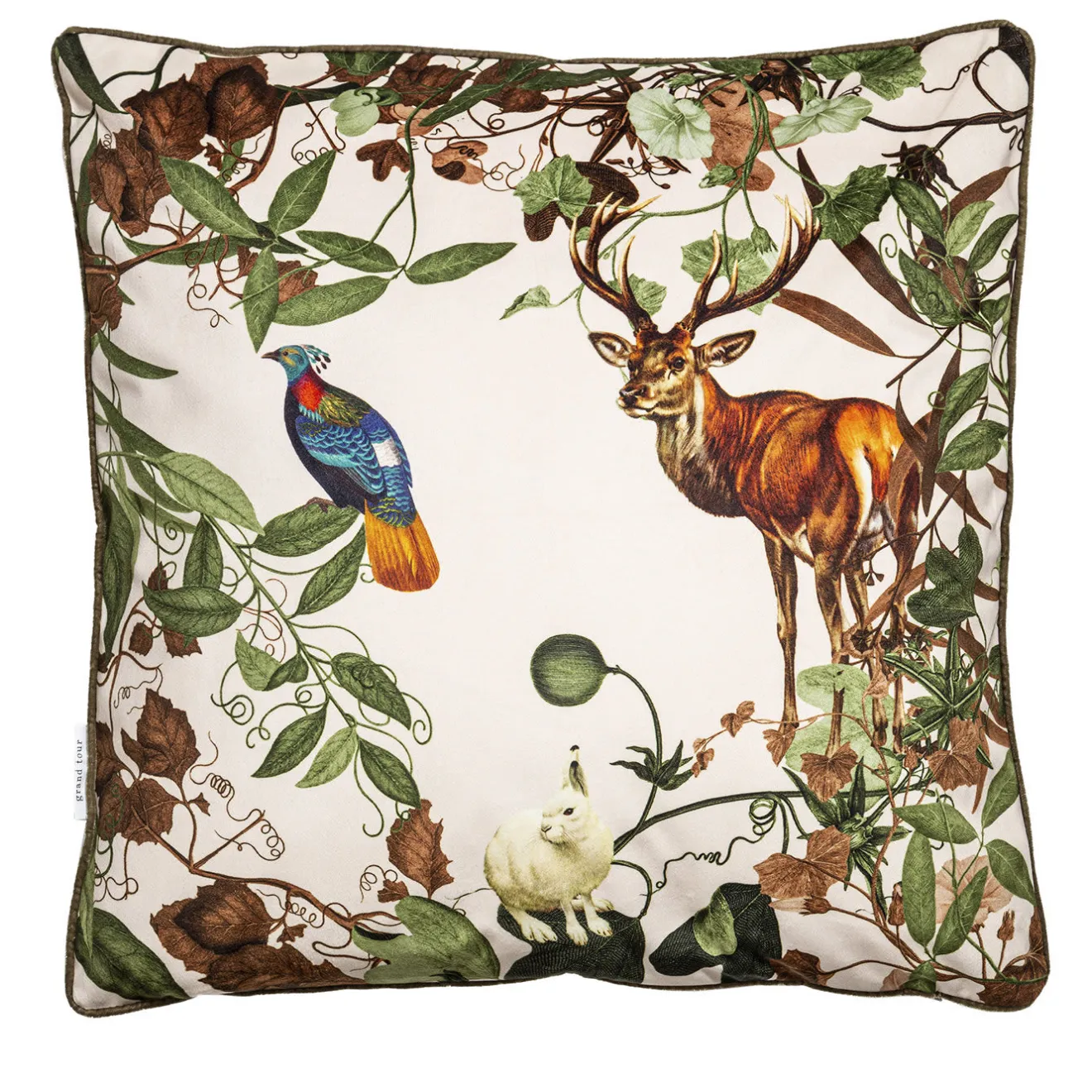 Questo incantevole cuscino appartiene a una serie esclusiva ispirata alla vegetazione e alla fauna tipiche delle Alpi, di cui il Monte Bianco è la vetta più alta. Un fagiano colorato, un cervo feroce e un coniglio bianco sono incorporati nella graziosa cornice composta da rami e foglie che si intrecciano, stampati in toni vivaci sul rivestimento in velluto di poliestere bianco.
