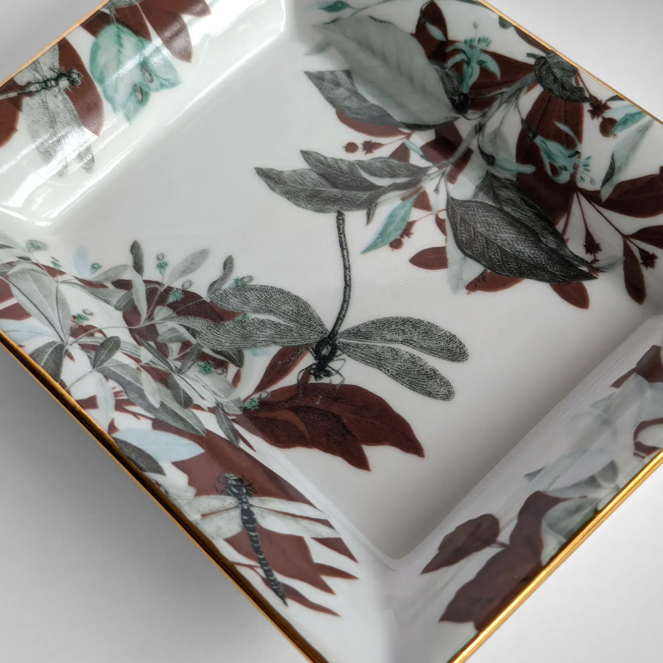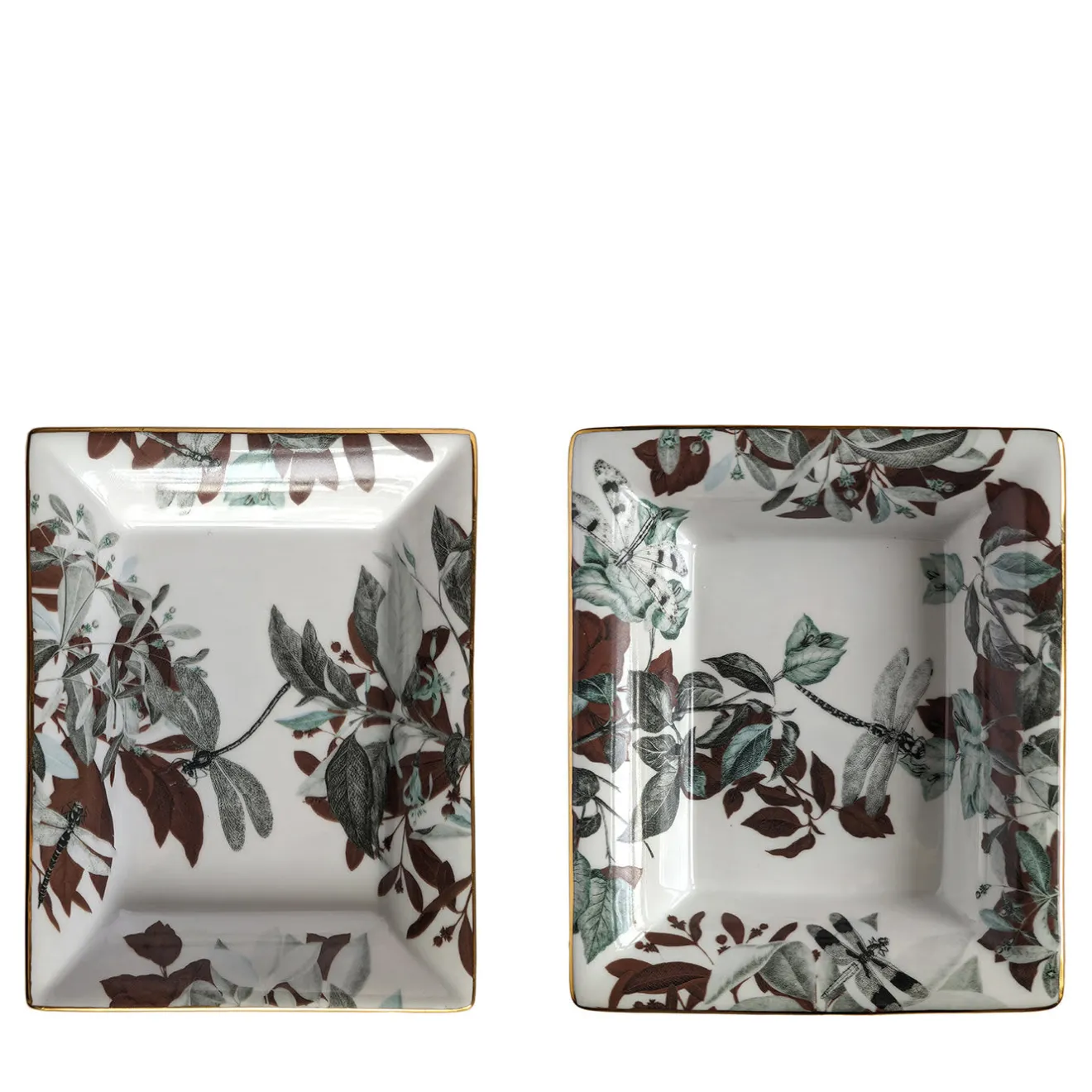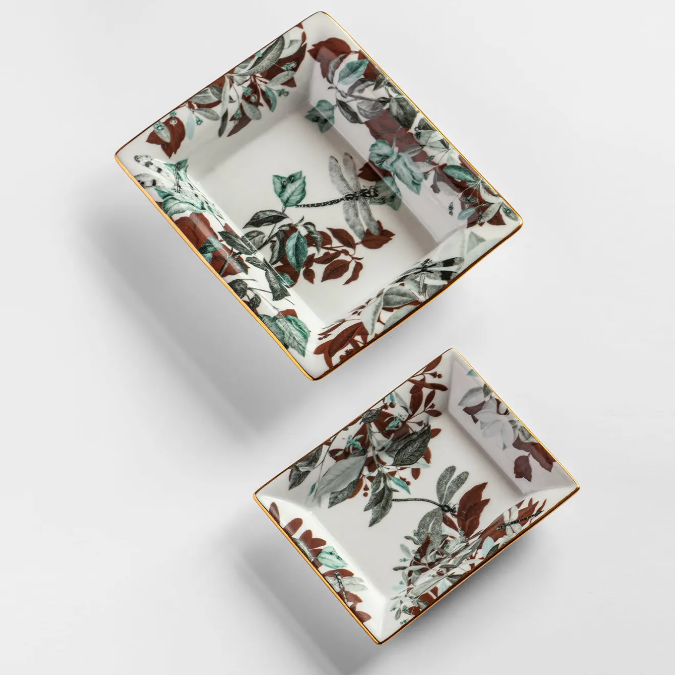 Questo set di porcellana fine, composto da un posacenere (cm 15 x 11,5 x 2,5 H) e da una vide-poche (cm 19,5 x 16 x 4 H), sarà un regalo apprezzato dagli appassionati di cultura orientale. Sigillate da un sottile bordo dorato, le loro superfici candide sono ornate da un rigoglioso fogliame stampato in tonalità verdi, ruggine e nere, con libellule raffigurate in alto. Il set prende il nome dal famoso laghetto omonimo del Parco della Primavera di Giada, in Cina.