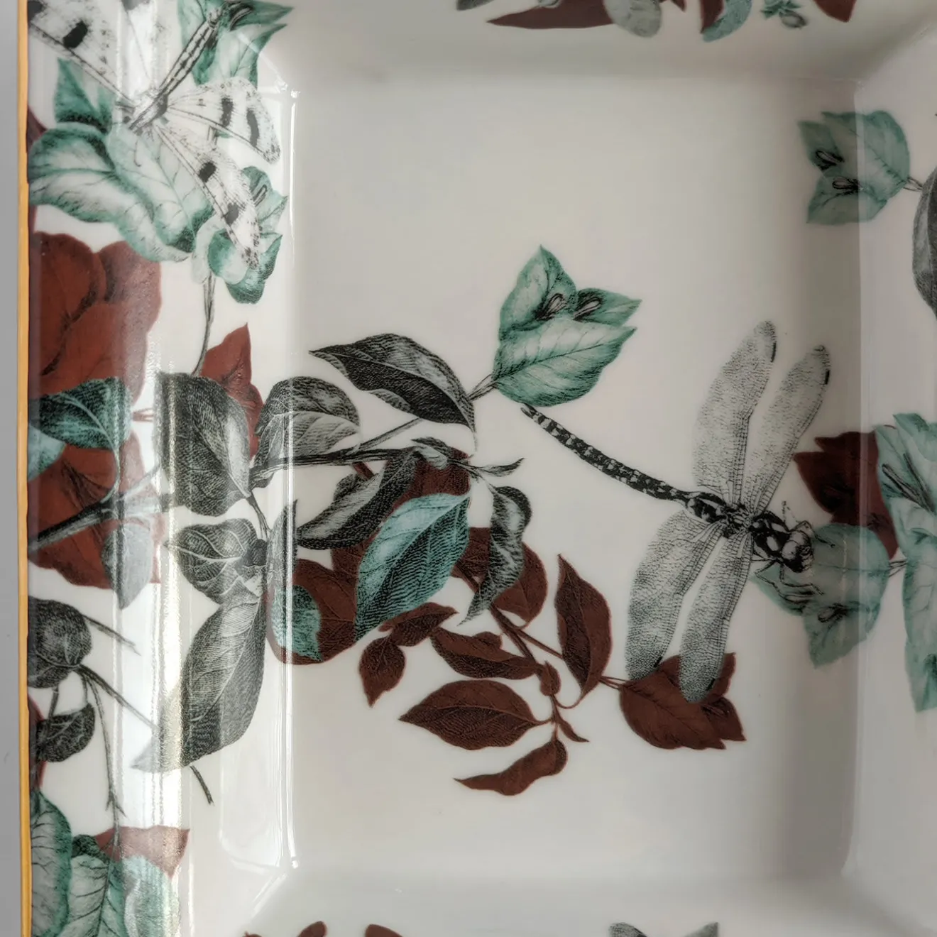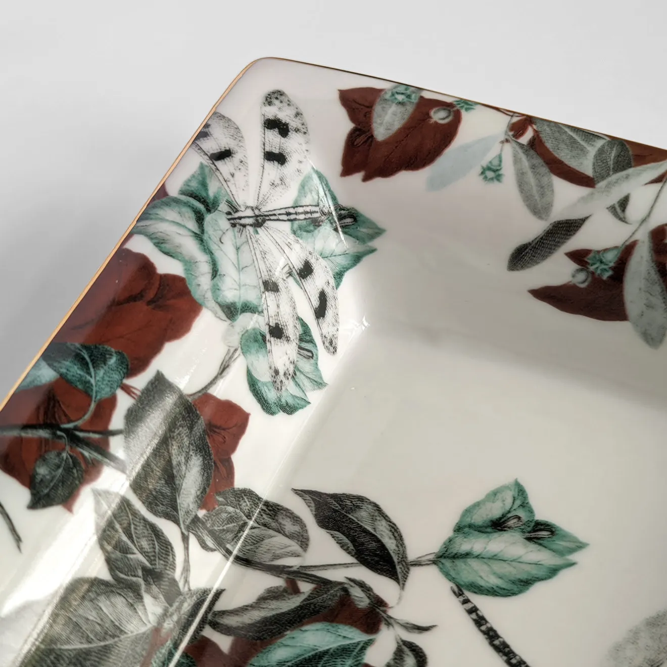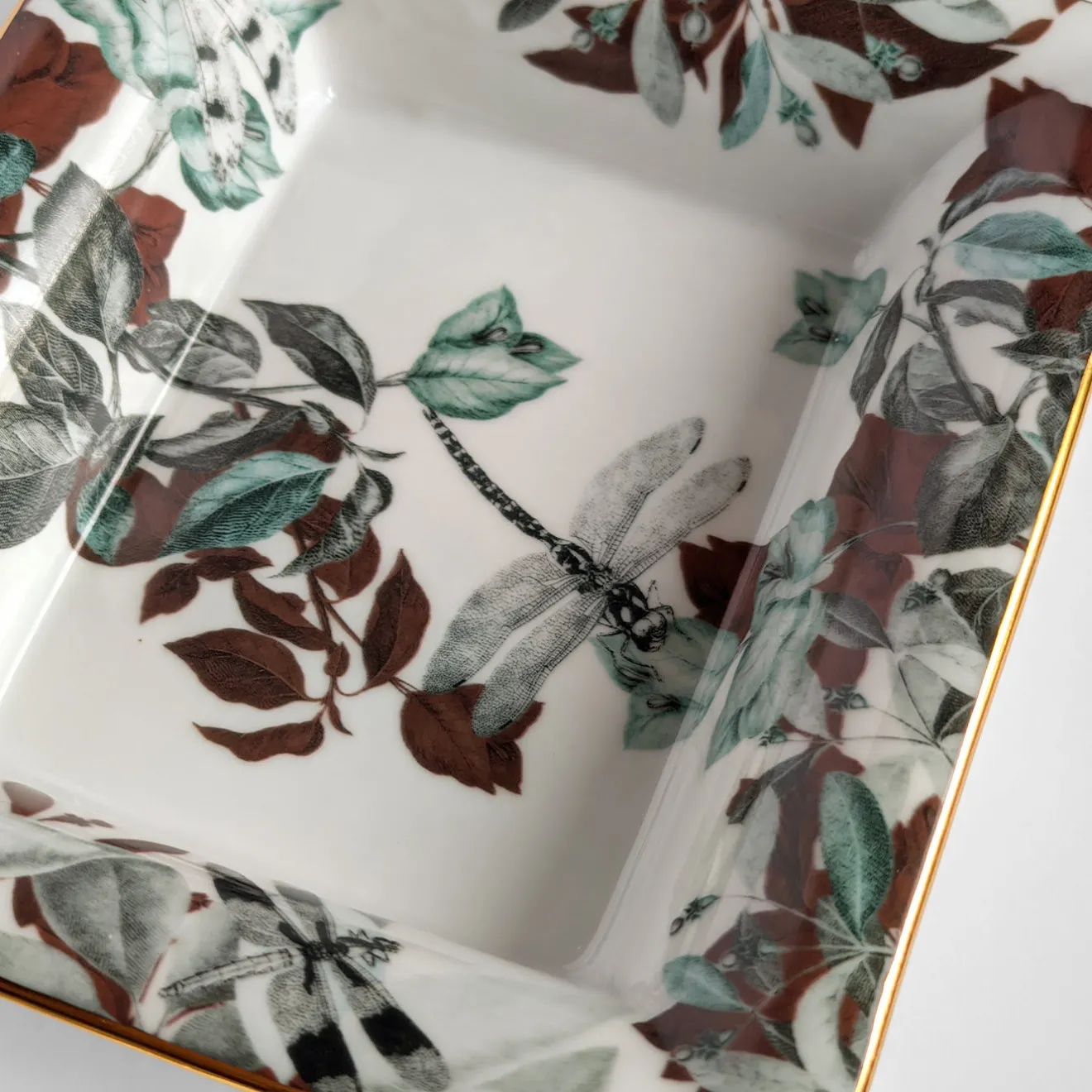 Questo set di porcellana fine, composto da un posacenere (cm 15 x 11,5 x 2,5 H) e da una vide-poche (cm 19,5 x 16 x 4 H), sarà un regalo apprezzato dagli appassionati di cultura orientale. Sigillate da un sottile bordo dorato, le loro superfici candide sono ornate da un rigoglioso fogliame stampato in tonalità verdi, ruggine e nere, con libellule raffigurate in alto. Il set prende il nome dal famoso laghetto omonimo del Parco della Primavera di Giada, in Cina.