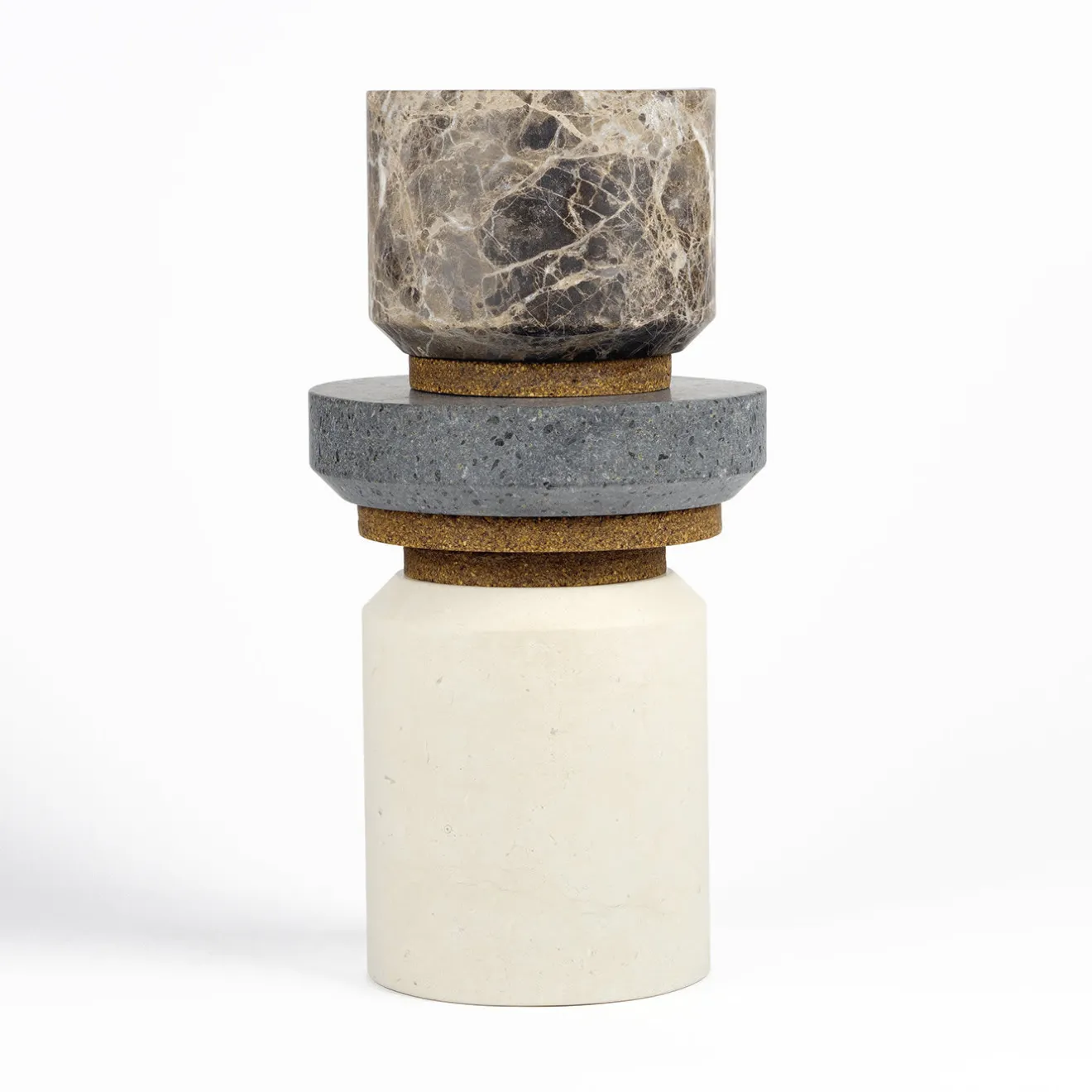 Una collezione composta da tre elementi di contenimento in Pietra di Trani, Pietra Lavica ed Emperador Light con coperchio in Keep Life; un nuovo materiale composito, ecologico e malleabile, ricavato dai gusci di nocciole, castagne, noci, mandorle, pistacchi, arachidi, ecc. Racchiuso nel tempo, il contenitore diventa pietra e il contenuto il suo sigillo.